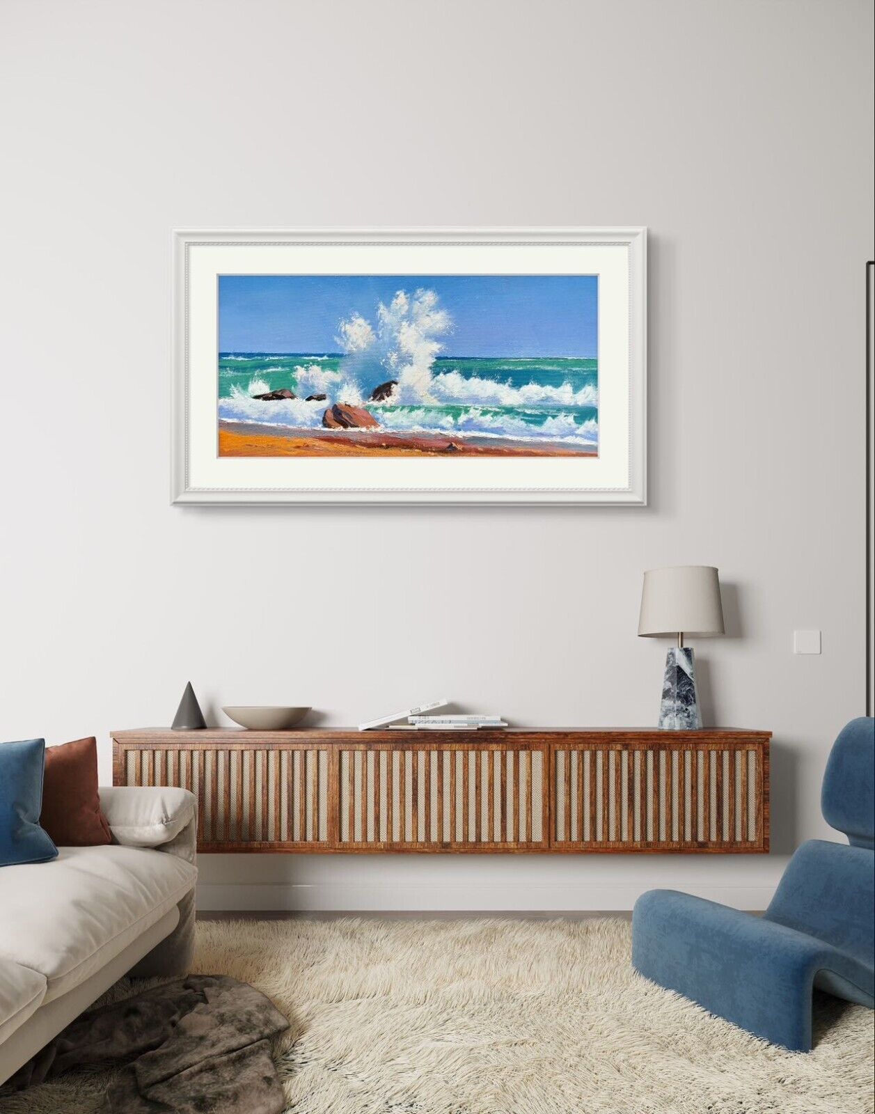 Add a touch of tranquility to your living room with this stunning handmade seascape oil painting on canvas. Created by artist Shehzad Kausar, this original piece captures the beauty of the ocean with its calming hues and intricate brushstrokes. Signed by the artist, this single piece is a true masterpiece that will enhance any room's decor. The unframed canvas measures [insert dimensions], and the painting's production technique brings out the texture and depth of the subject. Made in Okanagan, British Columbia, Canada, this painting is an original and not a licensed reproduction. Perfect for art enthusiasts and collectors alike, this timeless piece is a must-have for anyone who appreciates the beauty of nature and fine art.