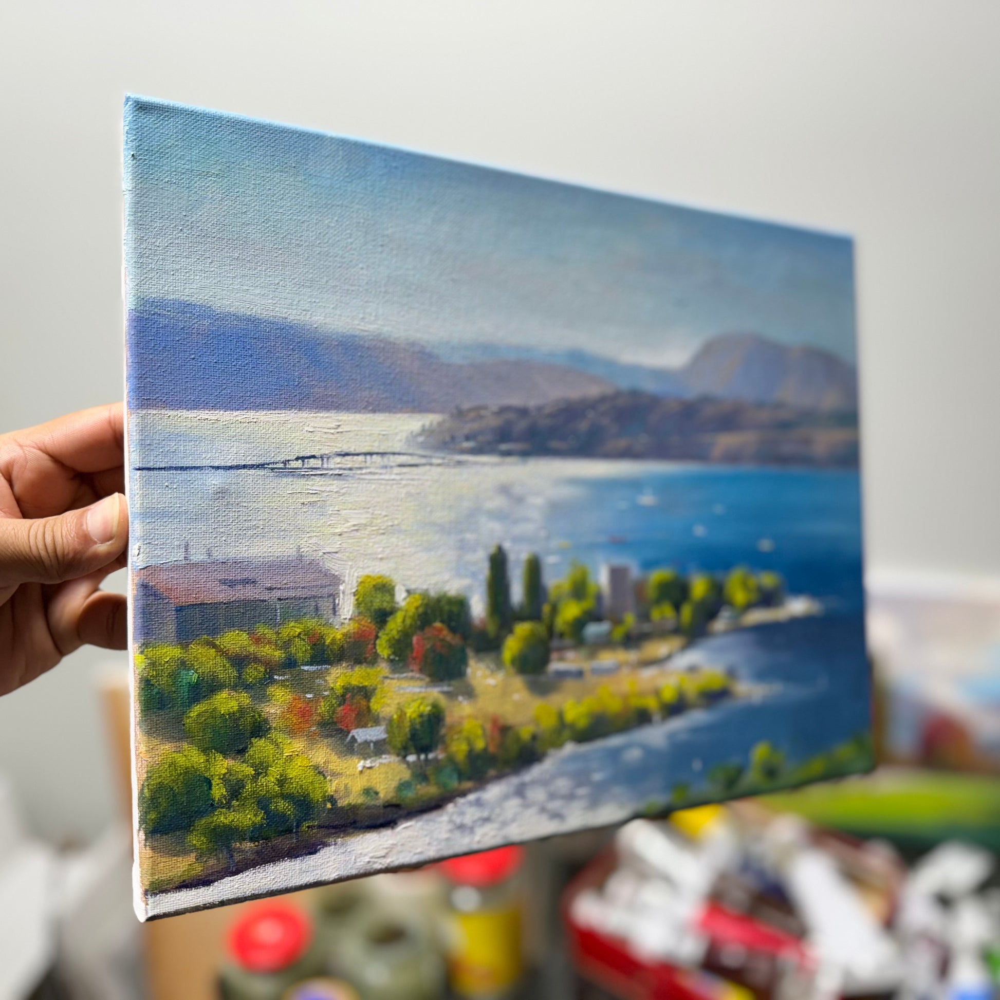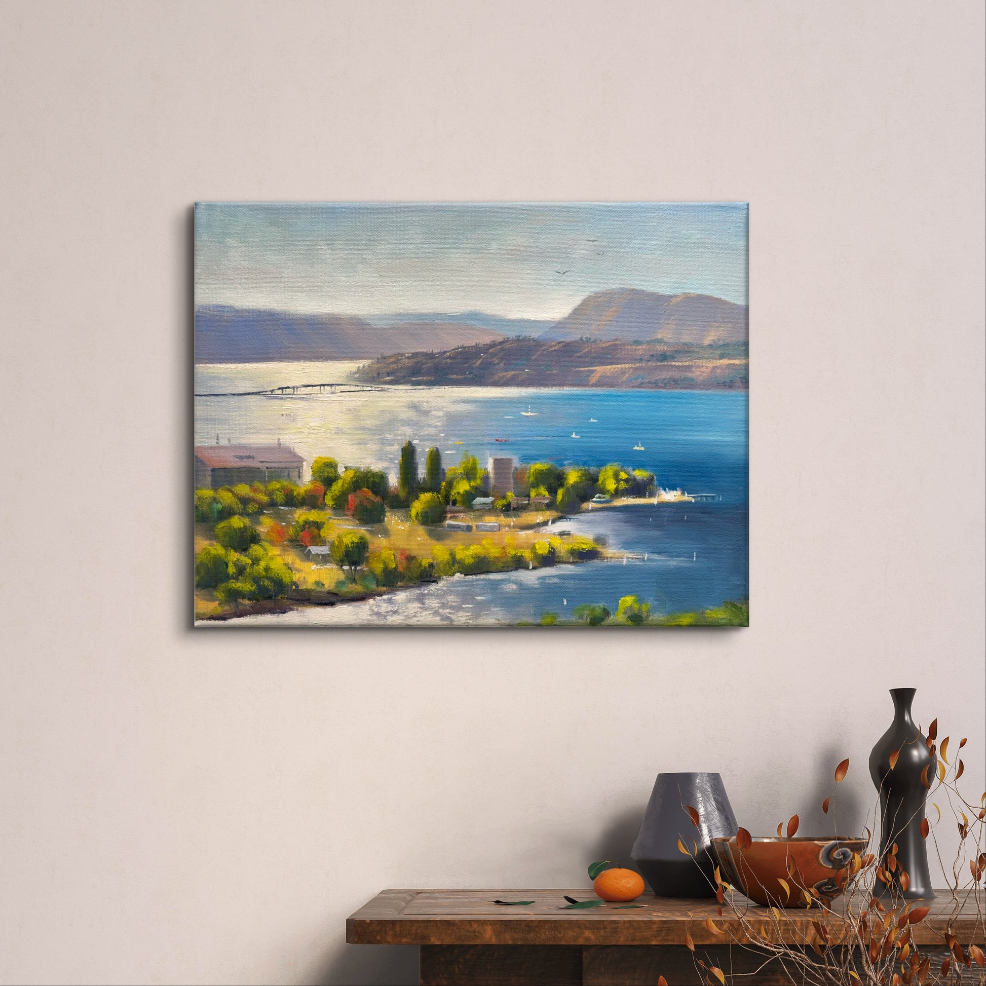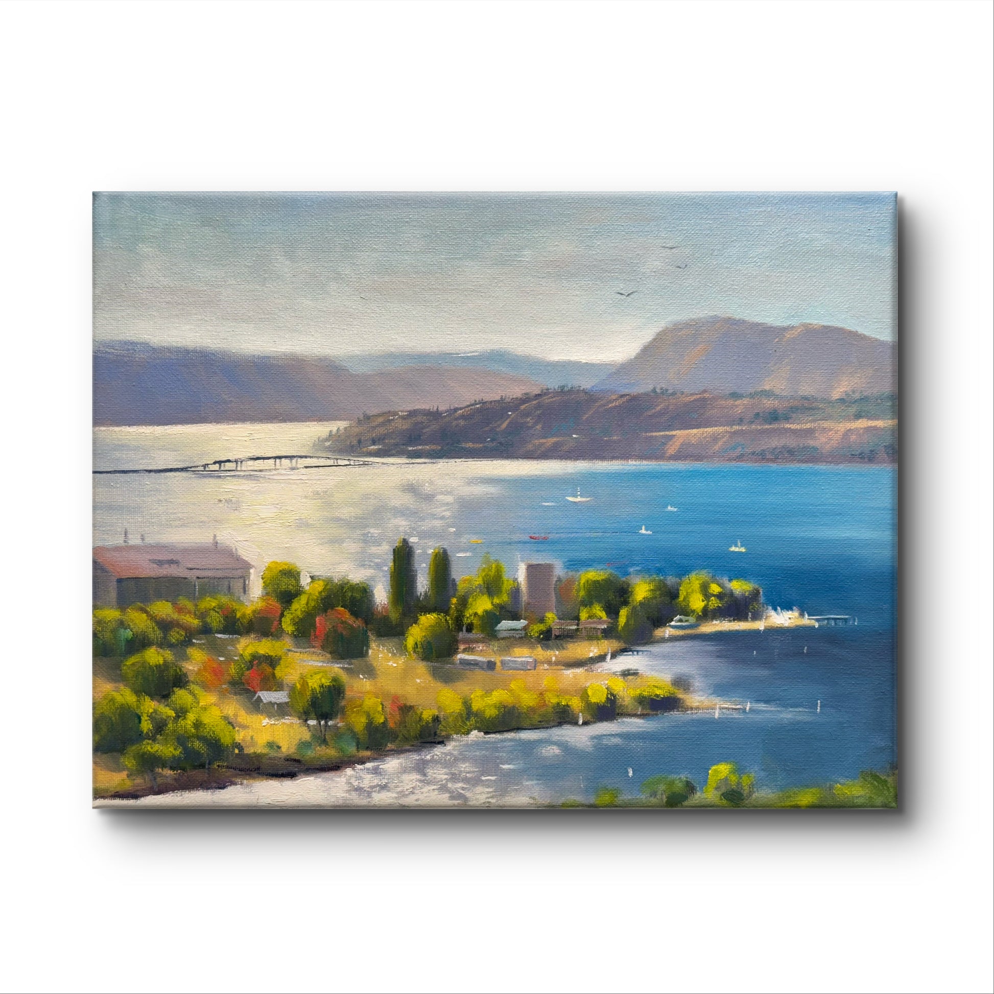 Bring the breathtaking beauty of Okanagan Lake into your home with this stunning, hand-painted original oil painting. Measuring 11"x14", this canvas artwork captures the serene waters, rugged shores, and majestic surrounding landscapes of the Okanagan Valley. The vibrant, natural colors and intricate brushwork evoke the tranquil atmosphere of this iconic Canadian lake, making it a perfect addition to any home or office décor.