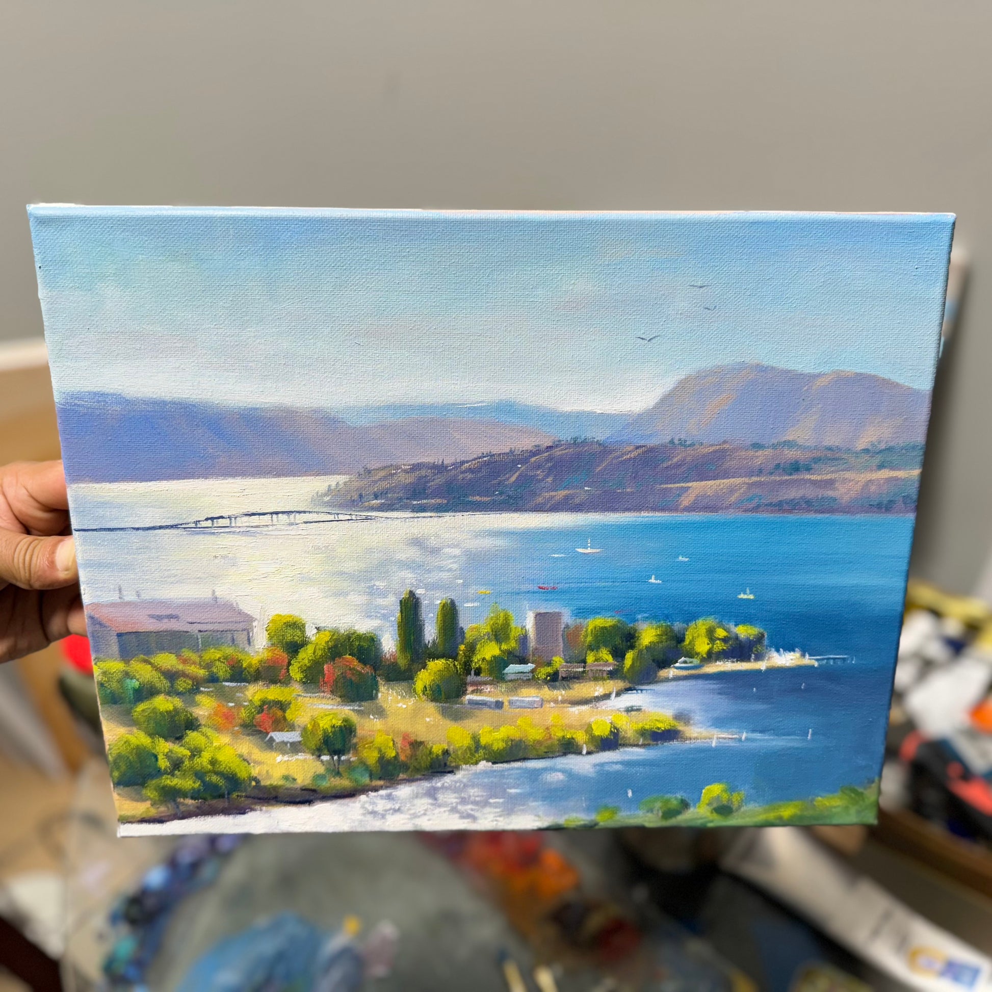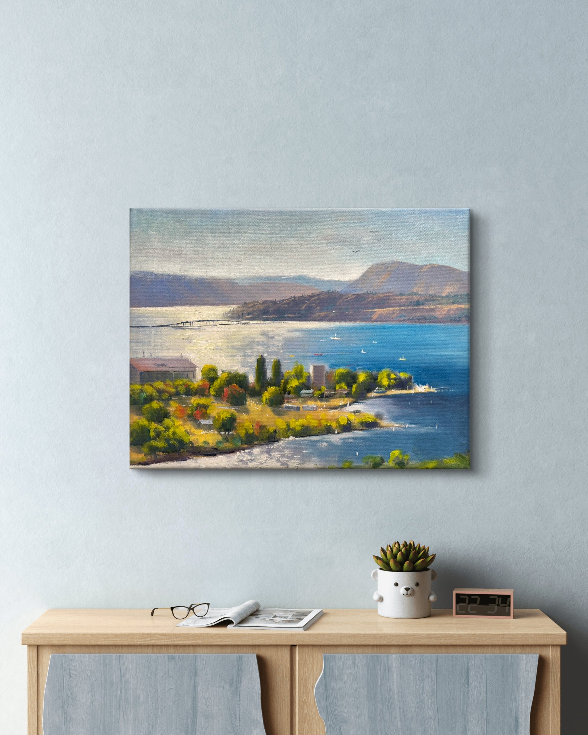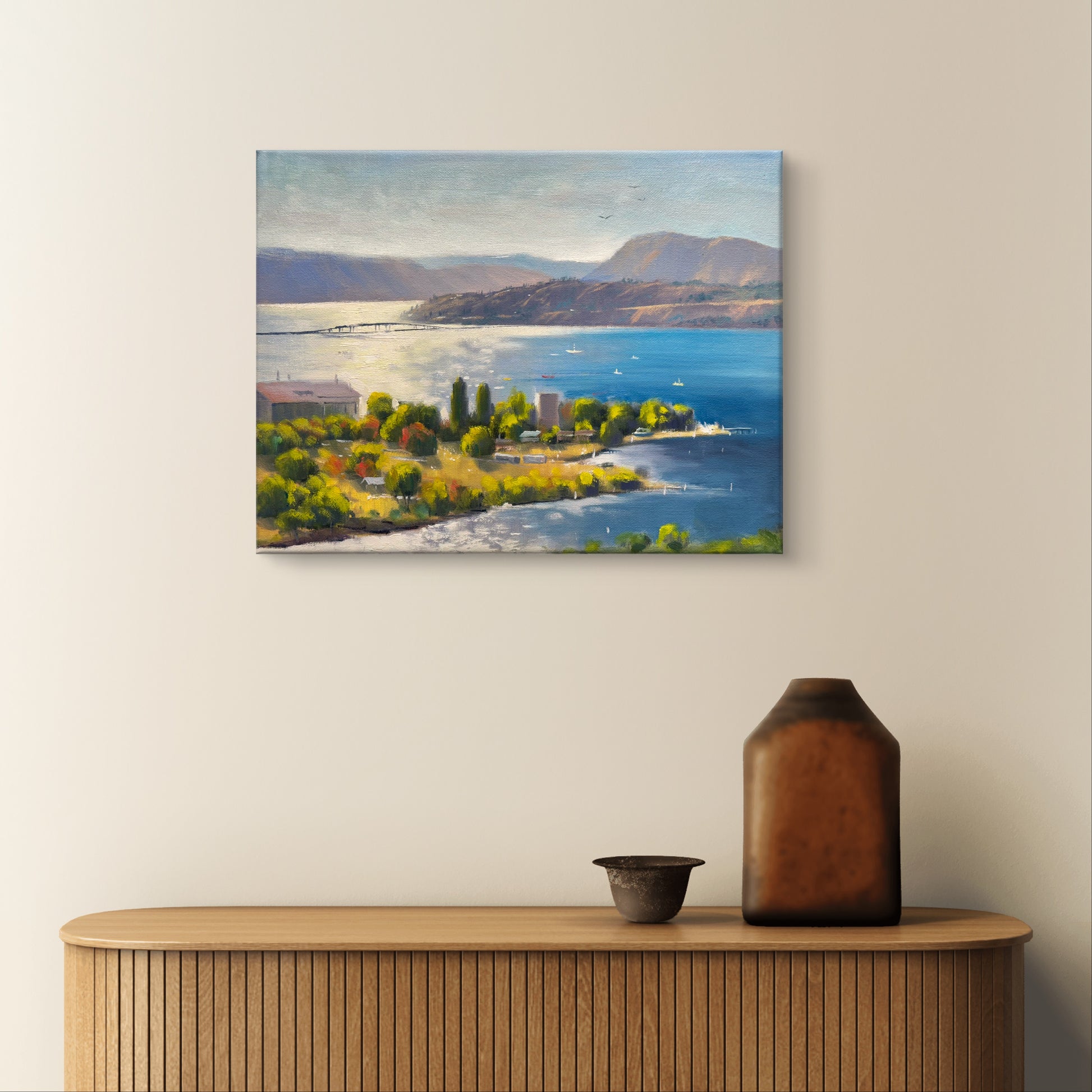 Bring the breathtaking beauty of Okanagan Lake into your home with this stunning, hand-painted original oil painting. Measuring 11"x14", this canvas artwork captures the serene waters, rugged shores, and majestic surrounding landscapes of the Okanagan Valley. The vibrant, natural colors and intricate brushwork evoke the tranquil atmosphere of this iconic Canadian lake, making it a perfect addition to any home or office décor.