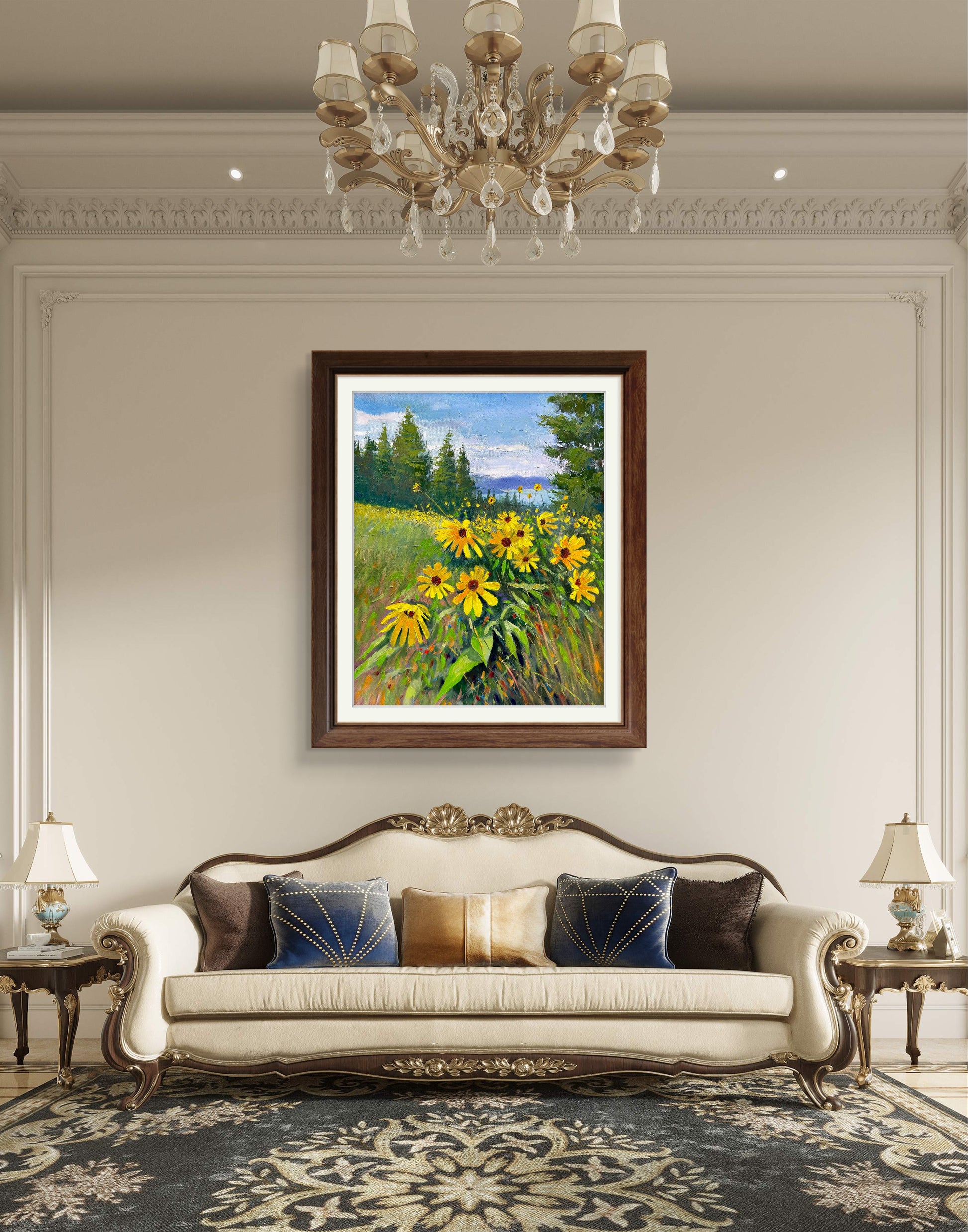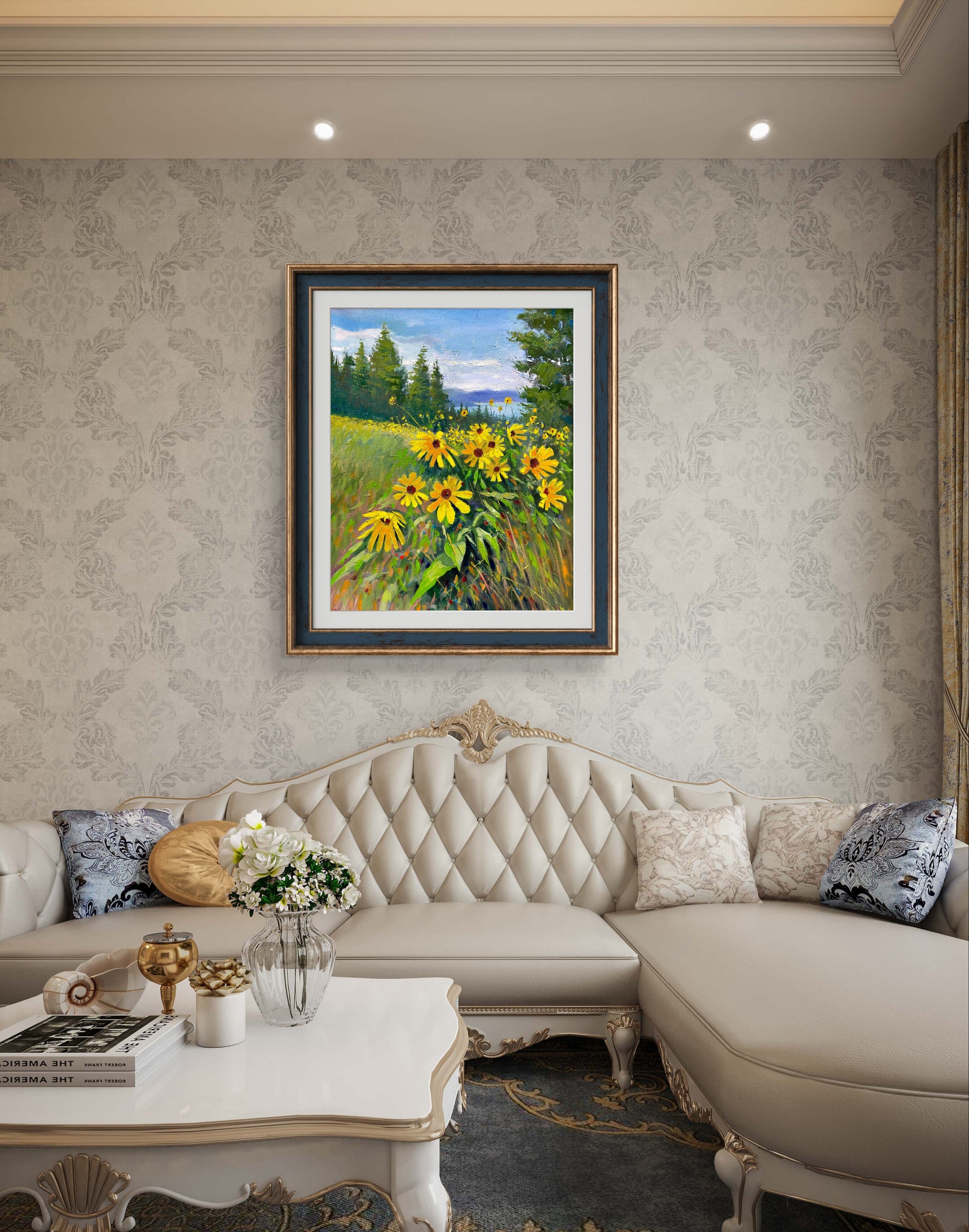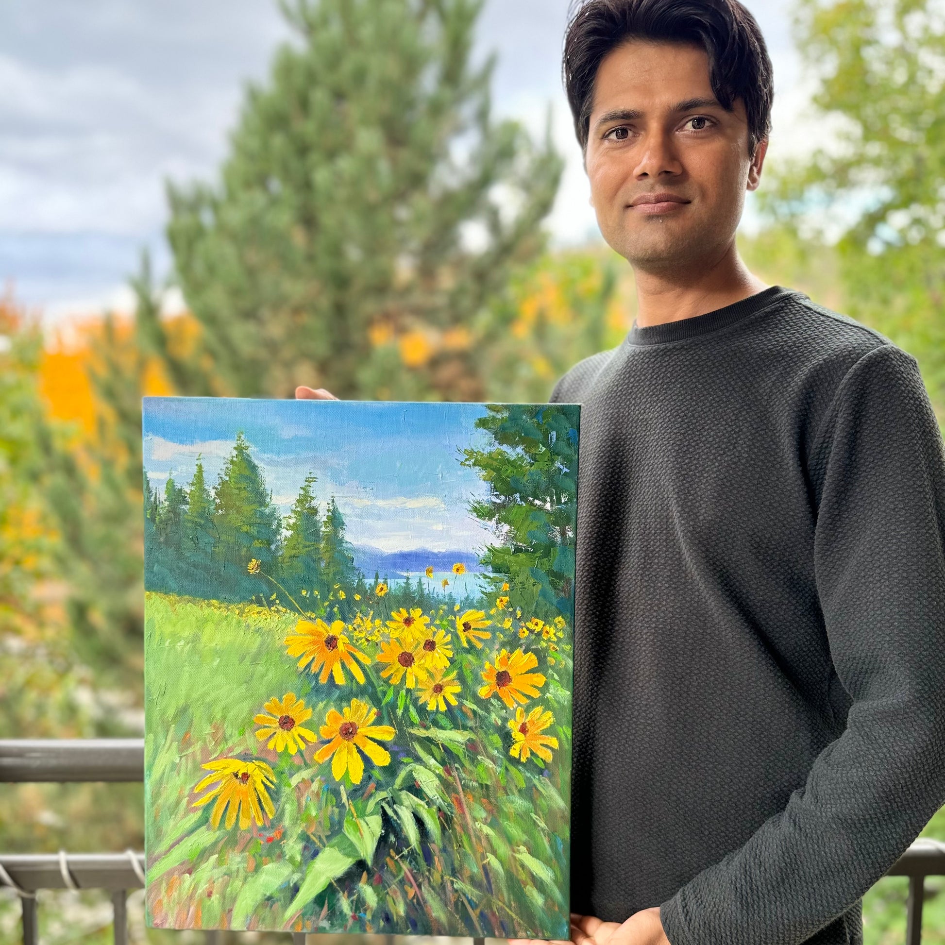 This stunning oil painting art piece is a wild yellow flowers Original landscape on Stretched Canvas. Created by Shehzad Kausar, this handmade artwork is signed by the artist and is an original production technique using oil paints. The piece depicts a beautiful landscape with vibrant yellow flowers and is framed in a single piece unit. The artwork is produced in British Columbia, Canada and is unframed, allowing for personalized framing to match any décor. This floral-themed piece is perfect for art enthusiasts and collectors alike and is sure to add a touch of nature to any room. Don't miss out on the opportunity to own this unique and one-of-a-kind artwork.