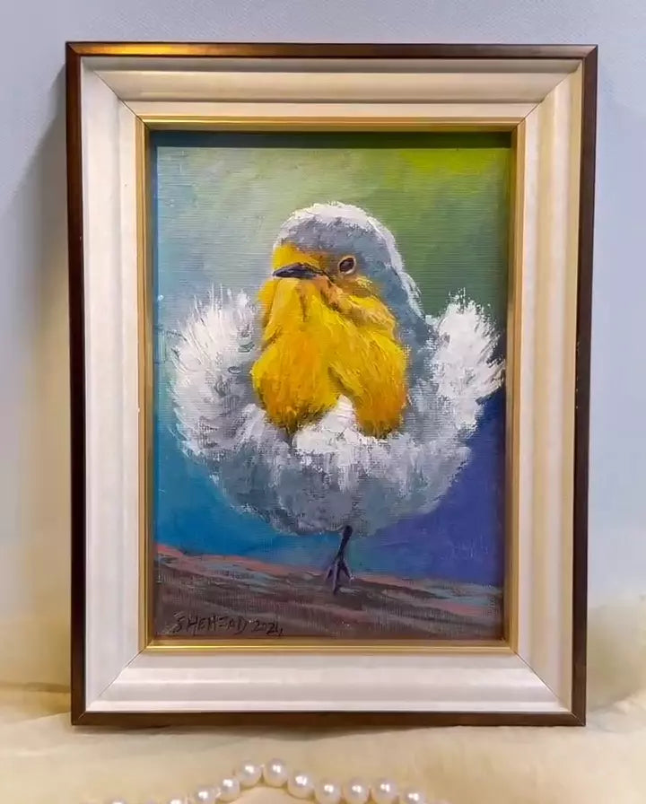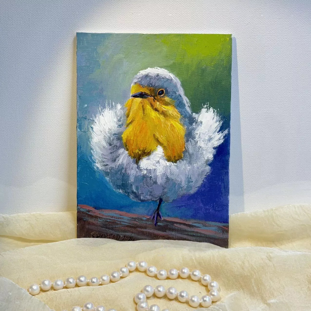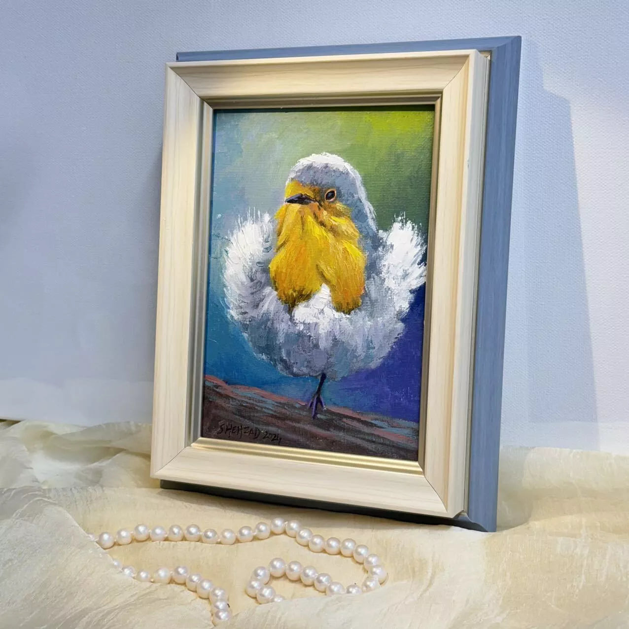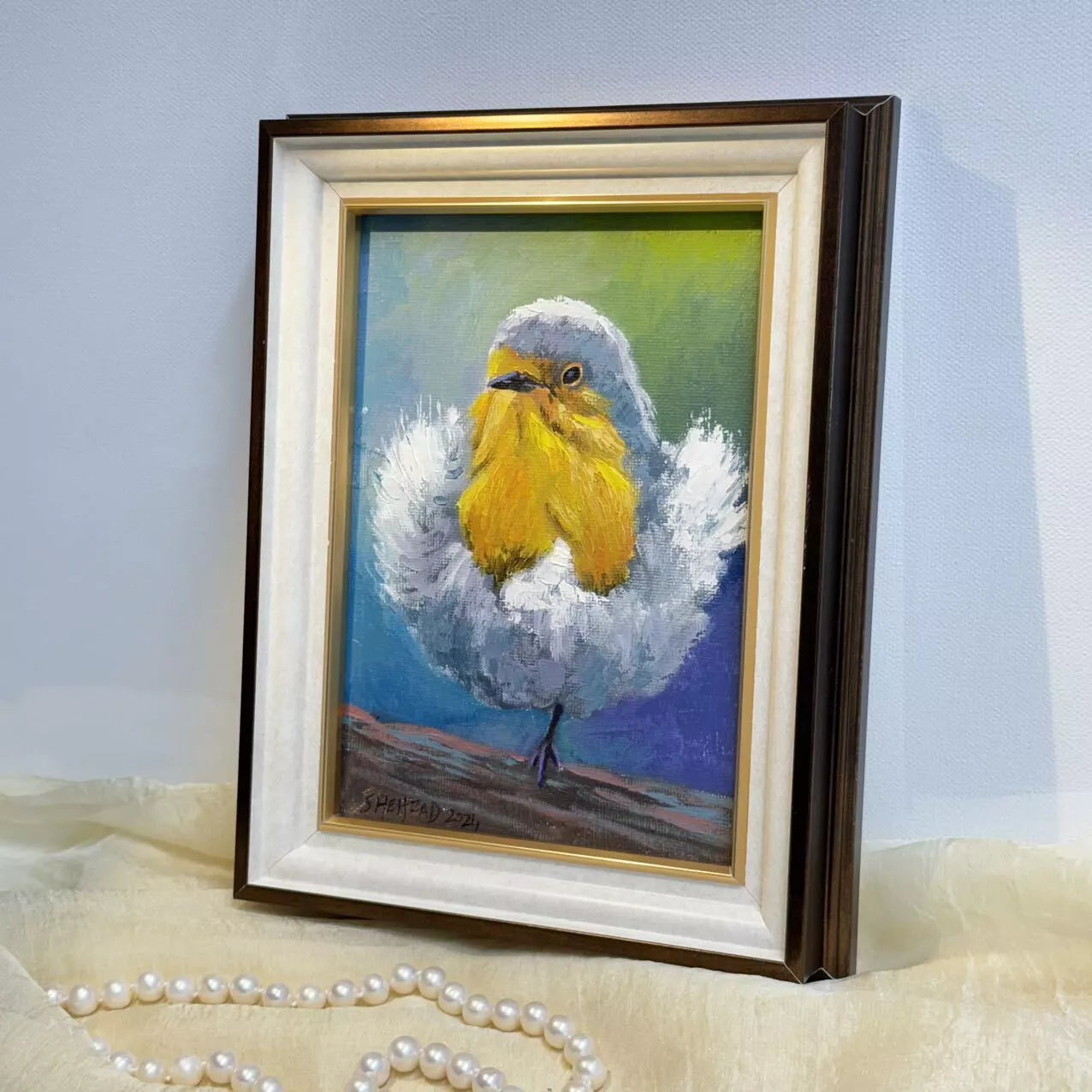 Bring the innocence and charm of nature into your home with this delightful original oil painting of a bird. Painted with meticulous attention to detail, this artwork captures the tender beauty of a young bird perched gently, embodying a sense of calm and wonder. The soft texture of the feathers, the delicate expression, and the subtle play of light and shadow make this piece a heartwarming addition to any space.