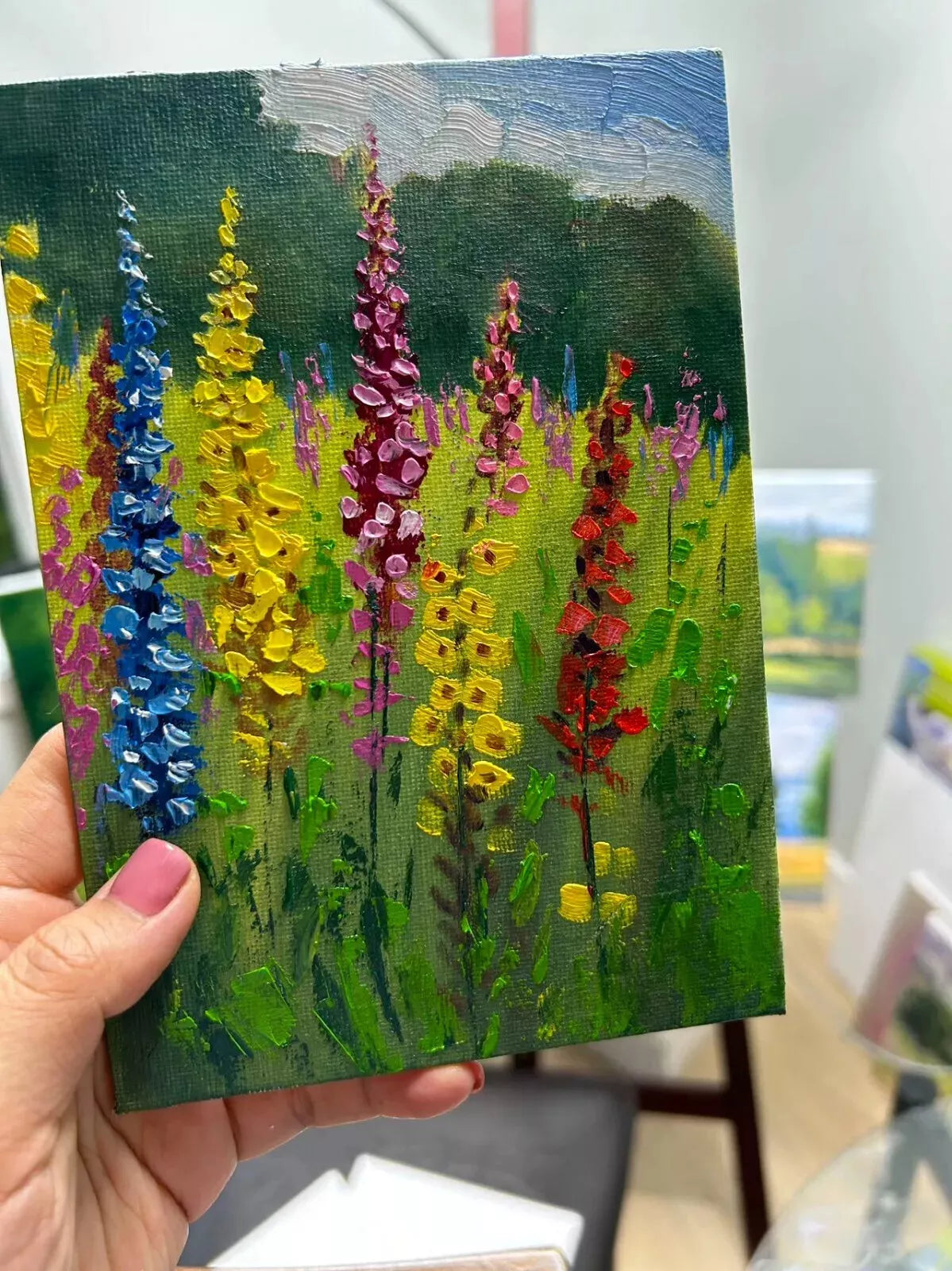 Immerse yourself in the charm and freshness of nature with "Wild Flowers Blossom," an original hand-painted oil painting. This beautiful piece captures a bouquet of wildflowers in full bloom, their delicate petals and lush green stems reaching toward the sky. The soft hues of purples, yellows, and whites evoke the wild and free spirit of nature, bringing a touch of the outdoors into your space. The expressive brushwork and layered textures give this painting depth and movement, making it a perfect addition to any room.