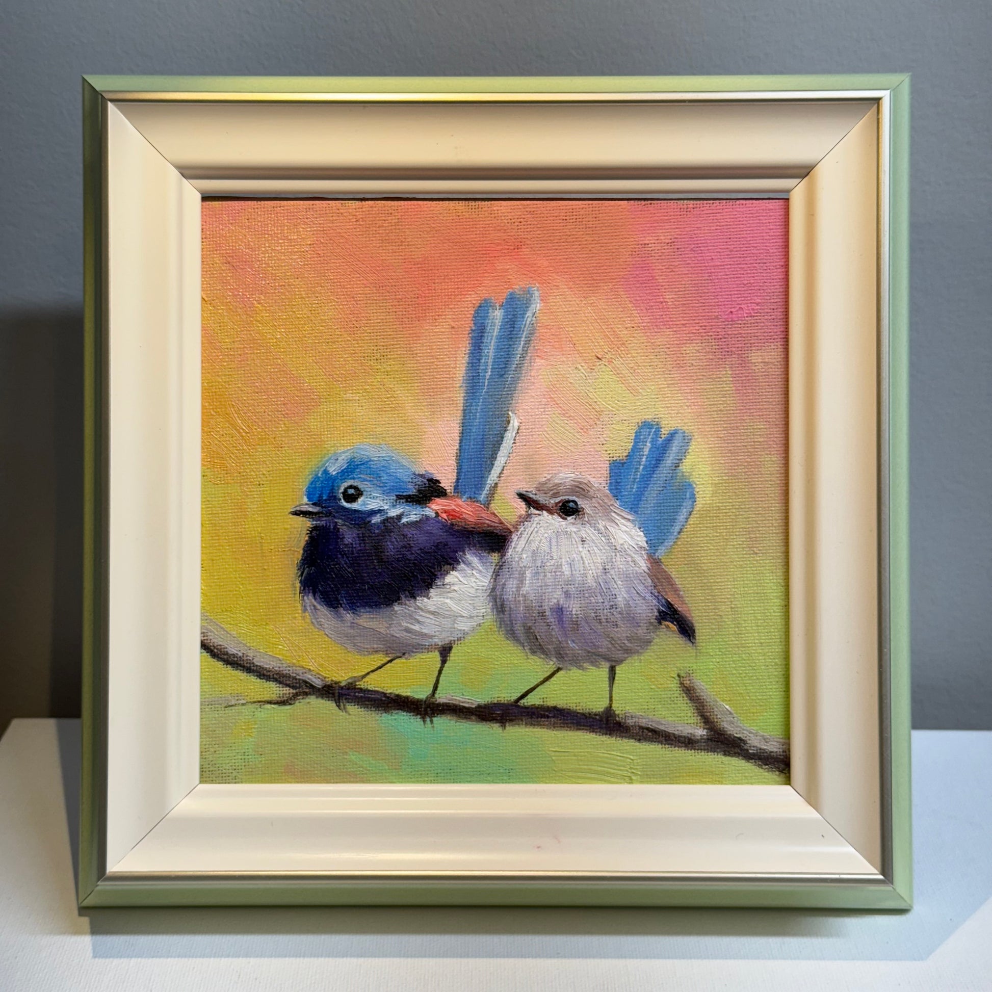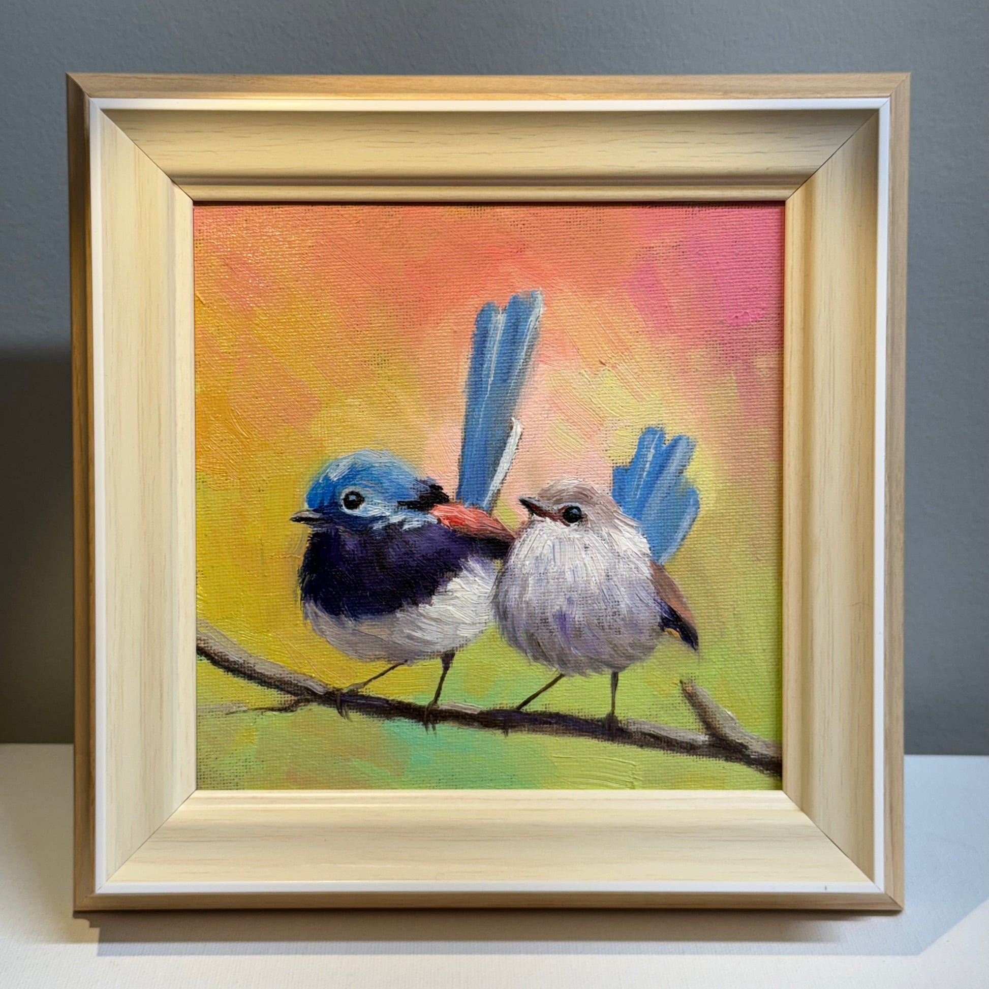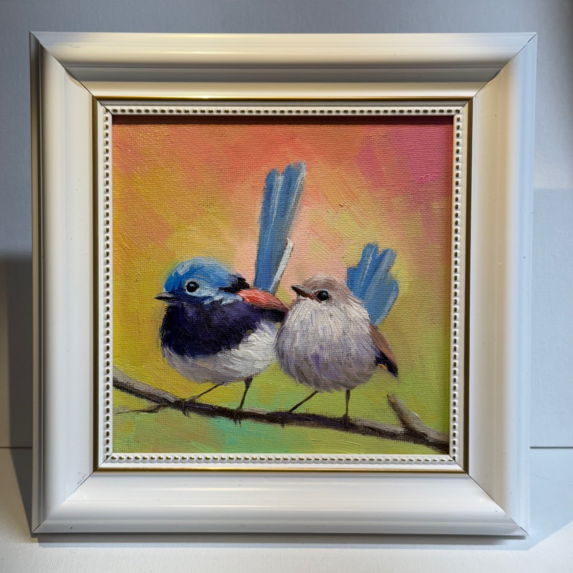 A charming oil painting of Cute Fairywrens perched on a branch, surrounded by a colorful, dreamy background. The soft brushstrokes give the birds a gentle, airy feel, while the vibrant hues add warmth and joy. Framed elegantly, this piece brings a touch of whimsy and tranquility to any space.