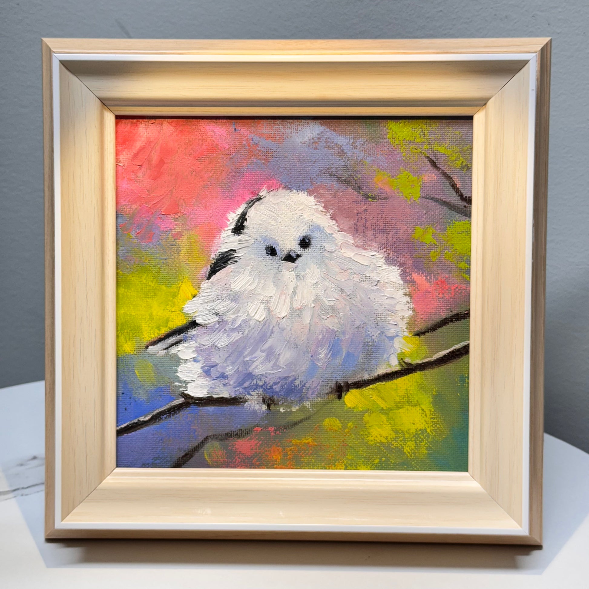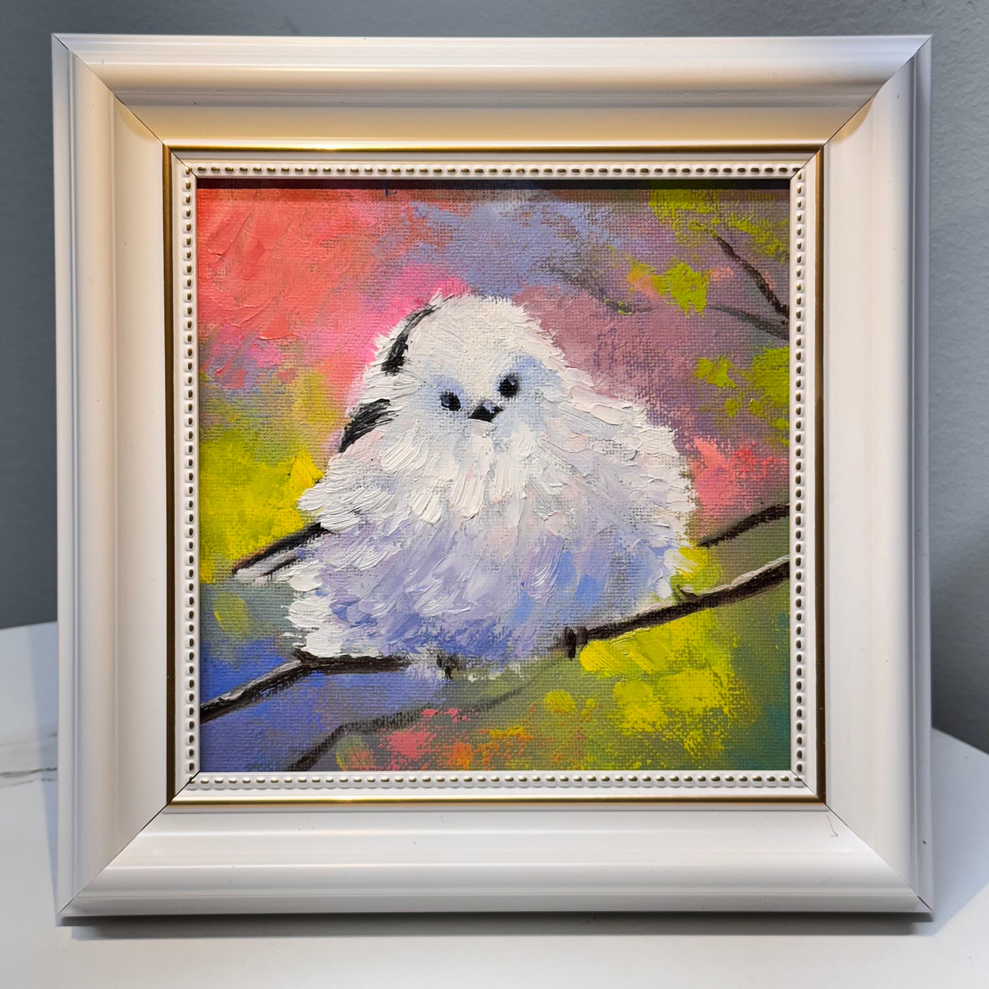 A charming oil painting of a fluffy snow fairy tit, Shima enaga white bird perched on a branch, surrounded by a colorful, dreamy background. The soft brushstrokes give the bird a gentle, airy feel, while the vibrant hues add warmth and joy. Framed elegantly, this piece brings a touch of whimsy and tranquility to any space.