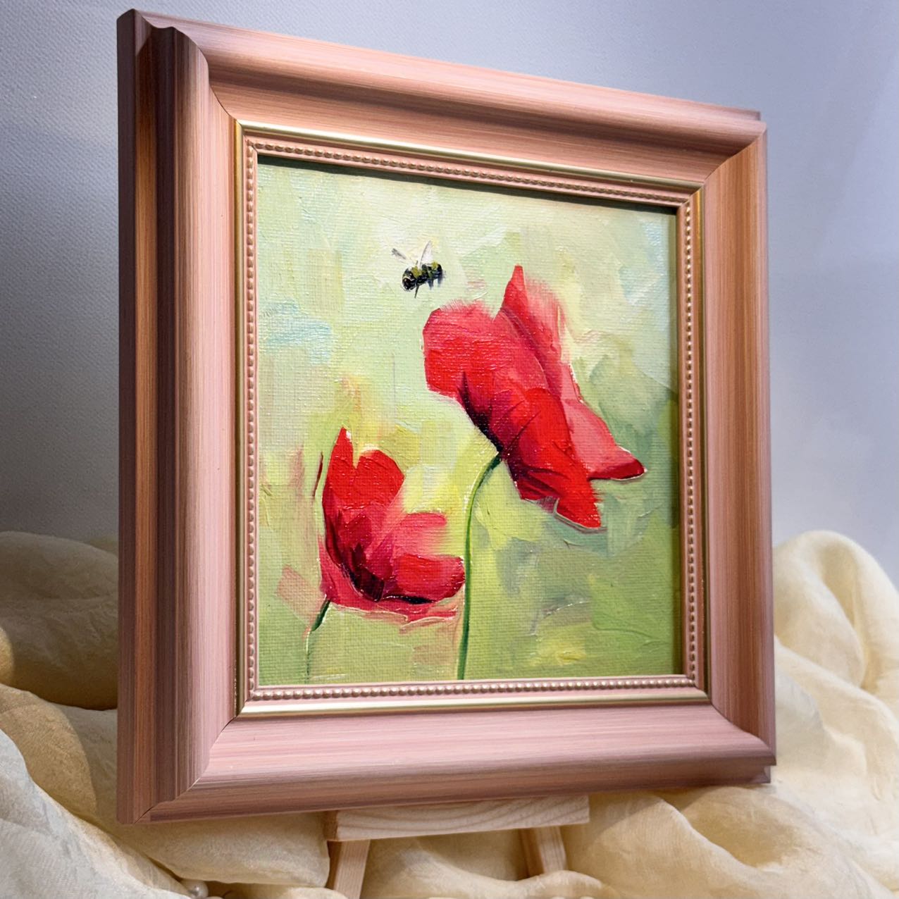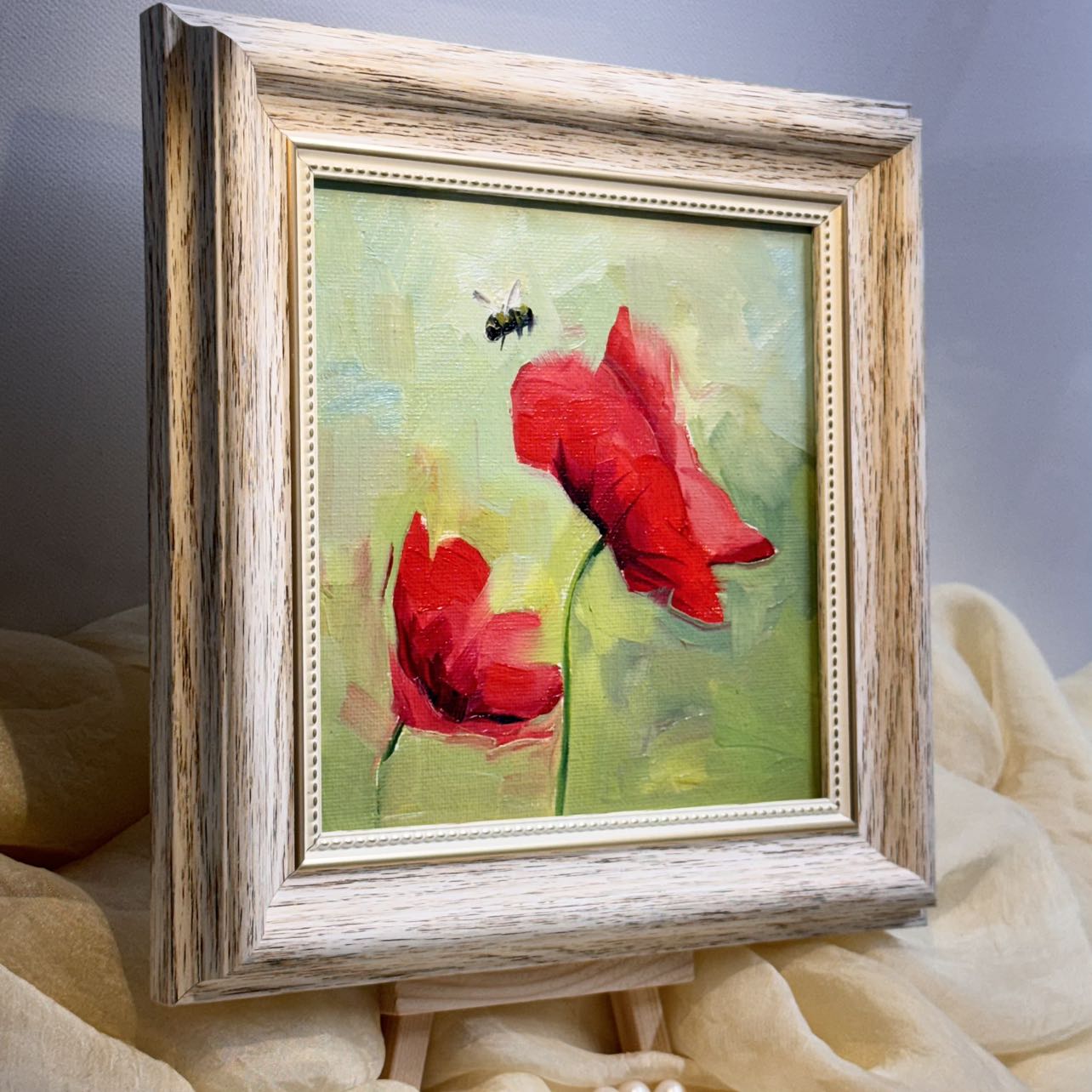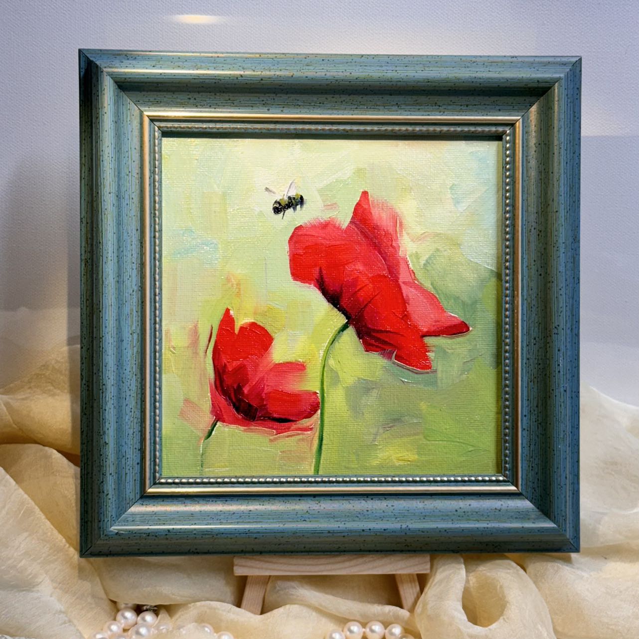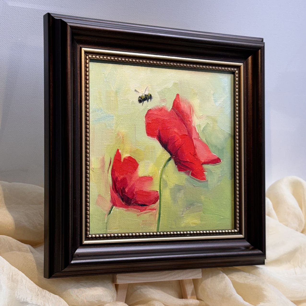 6"x6" Red Poppy flower Original Handmade oil painting on Canvas panel Wall Art