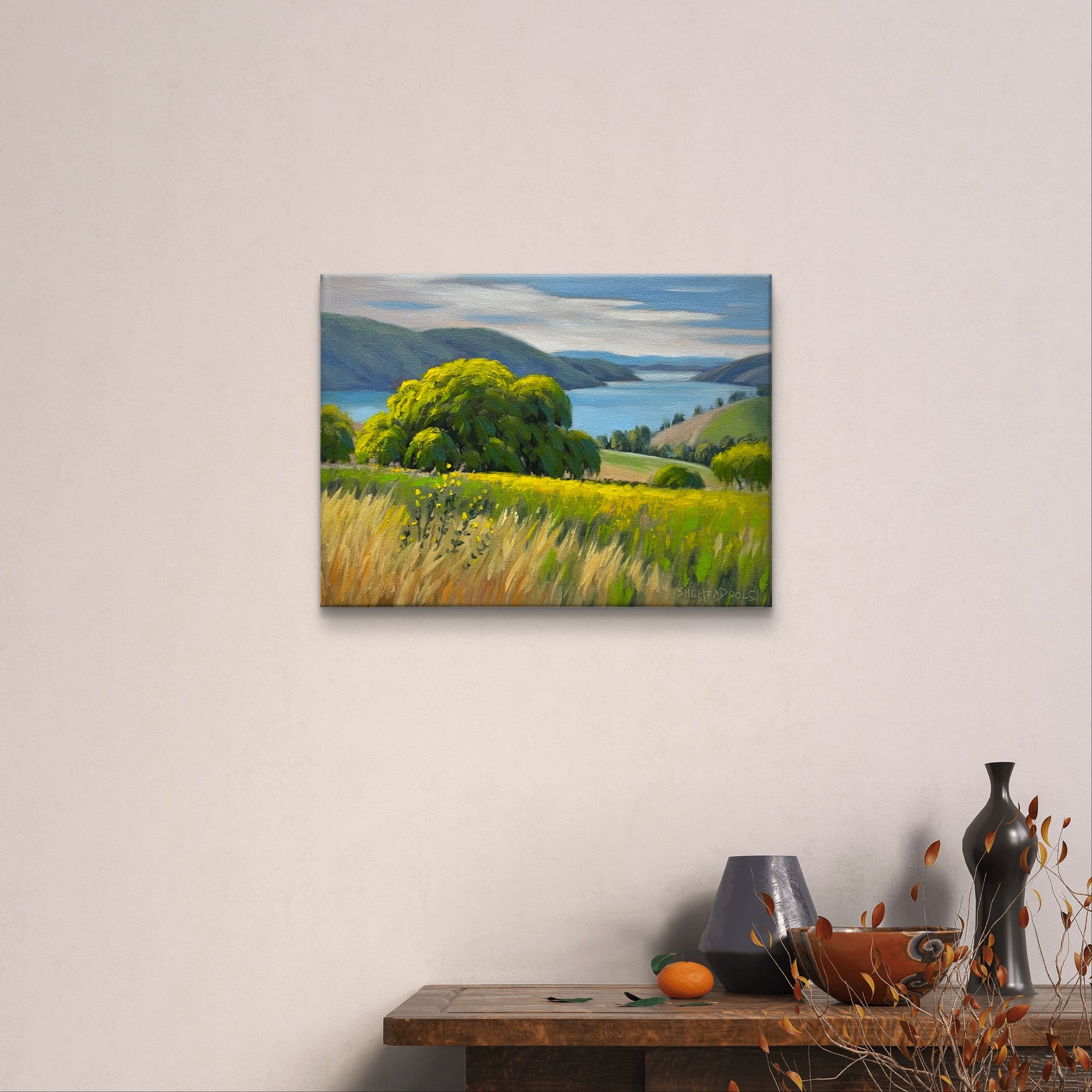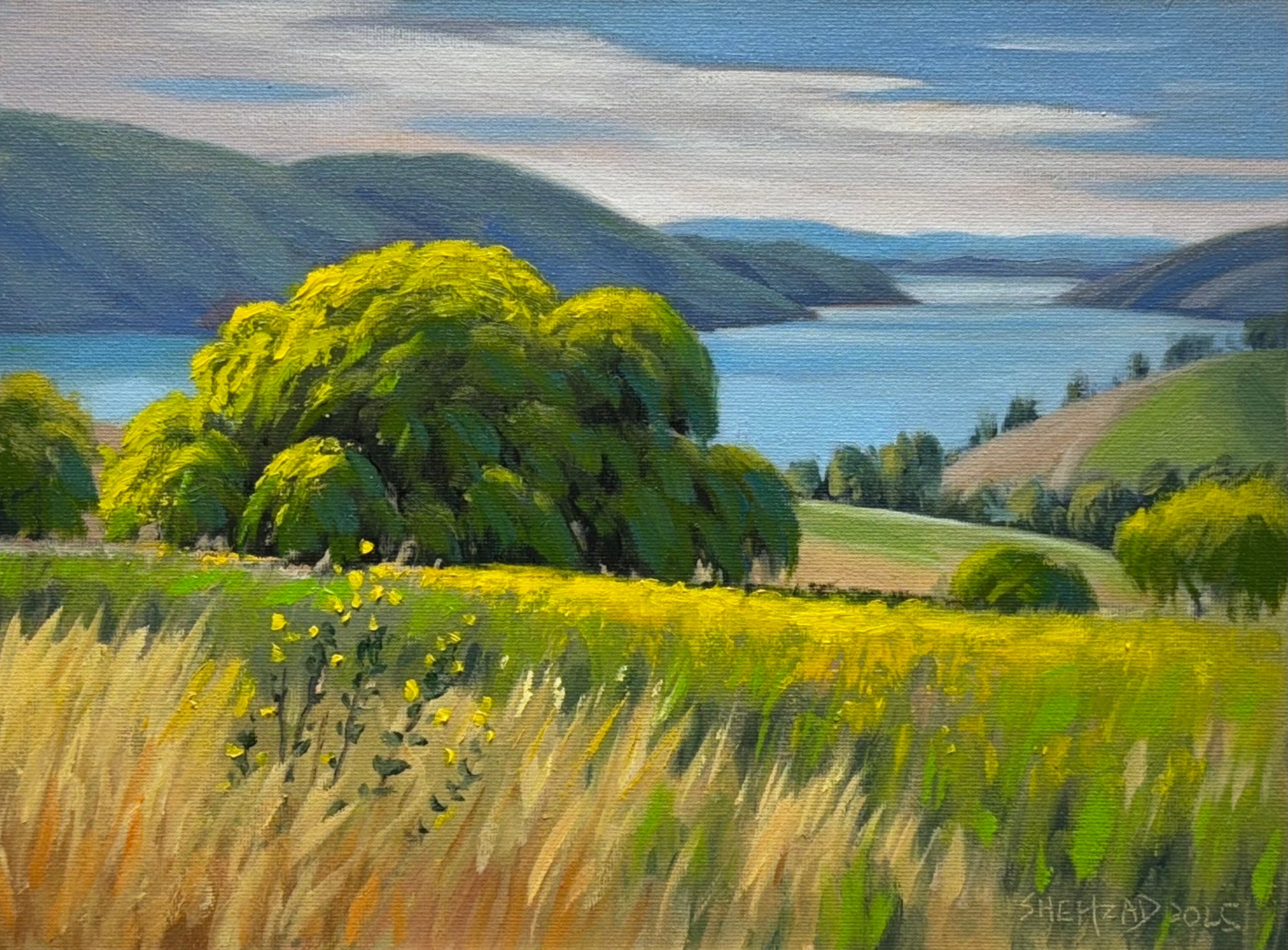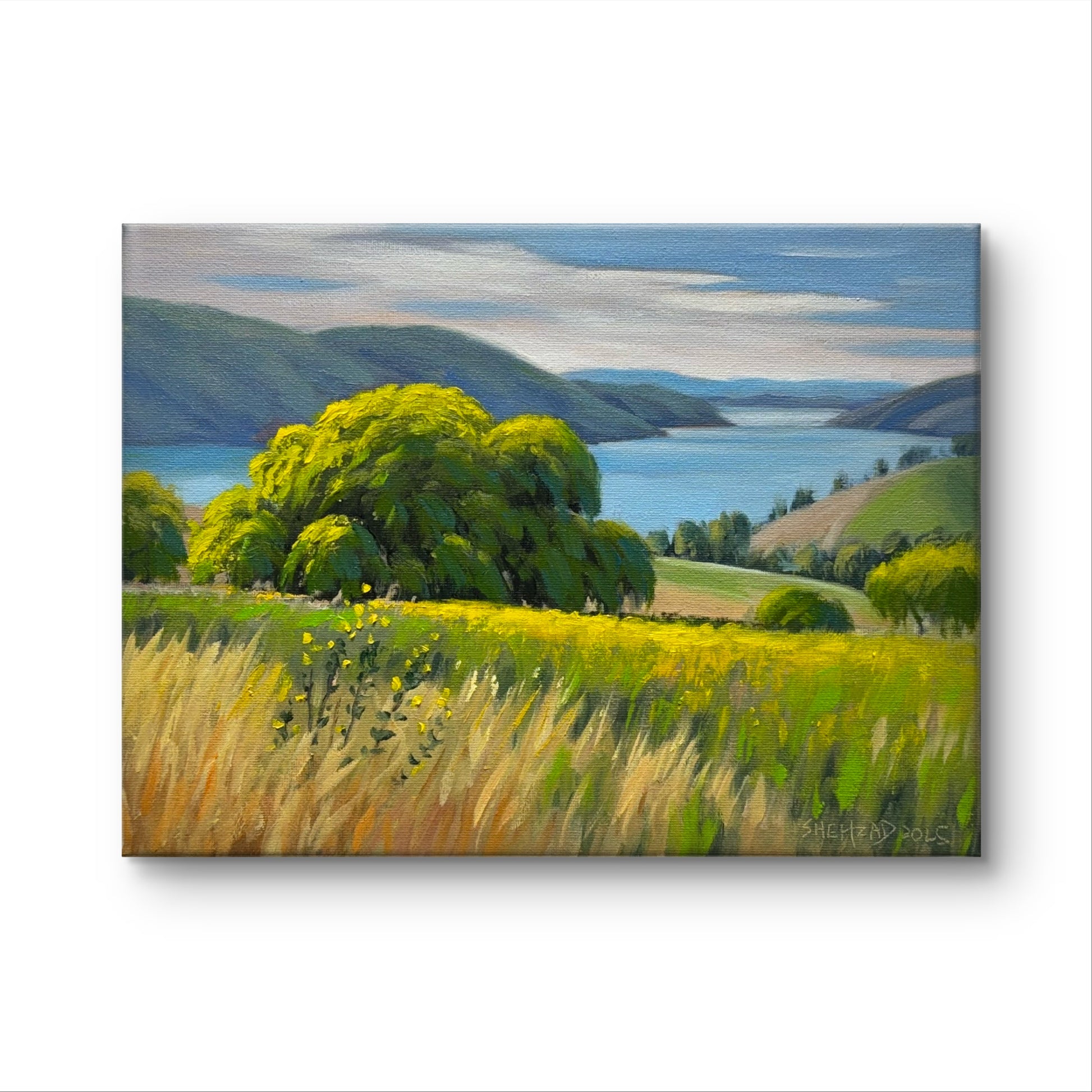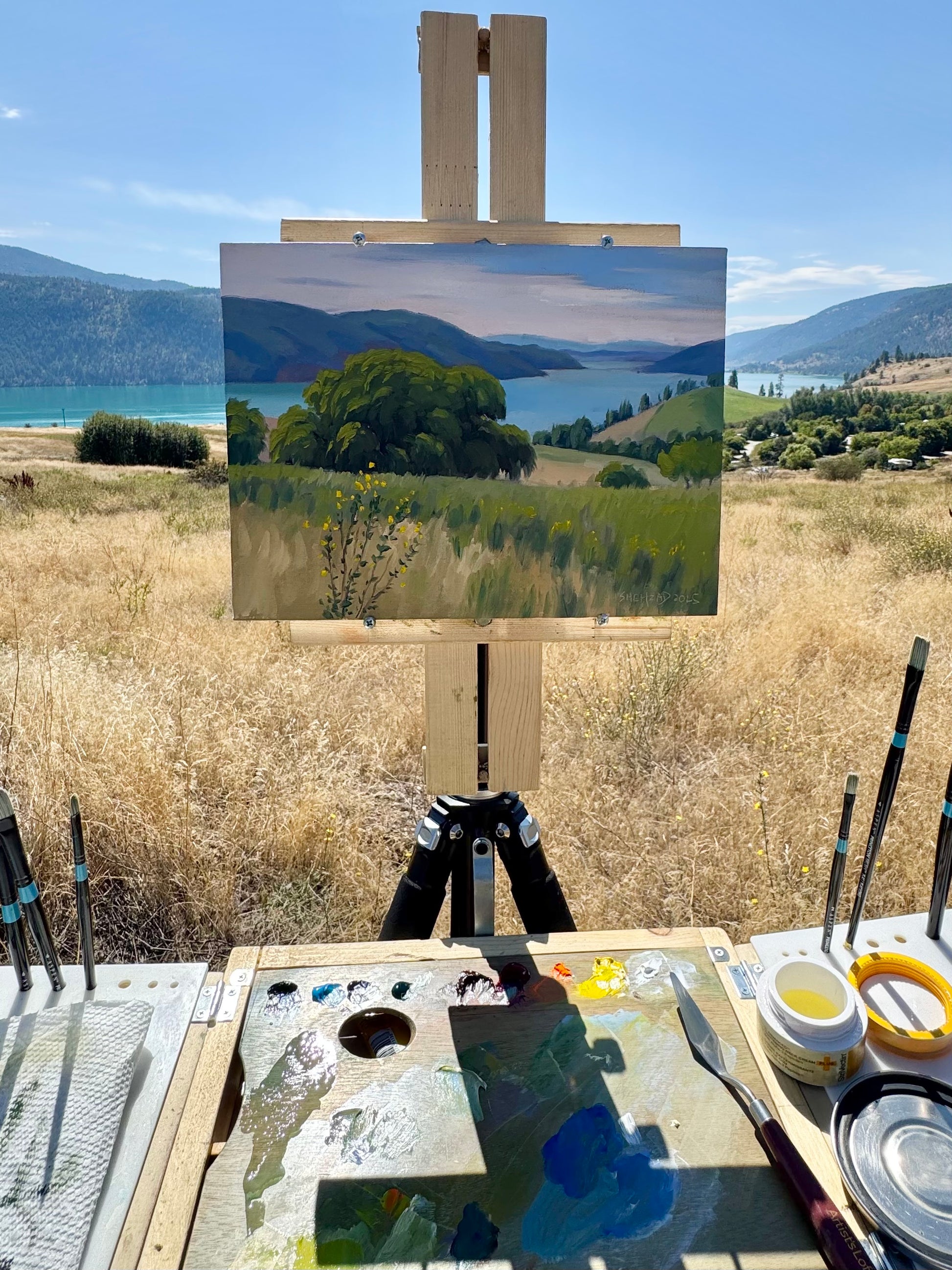 This original oil painting finished on spot at kalamalka lake - With bold brushwork and vibrant tones, the piece evokes the serene yet powerful presence of the landscape, offering a vivid impression of British Columbia’s interior. Painted on a 12x9" canvas panel,