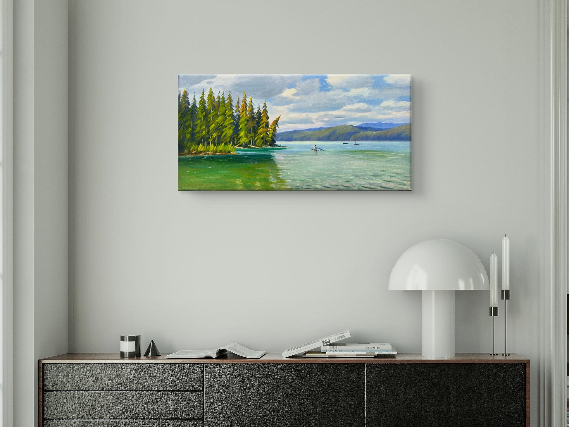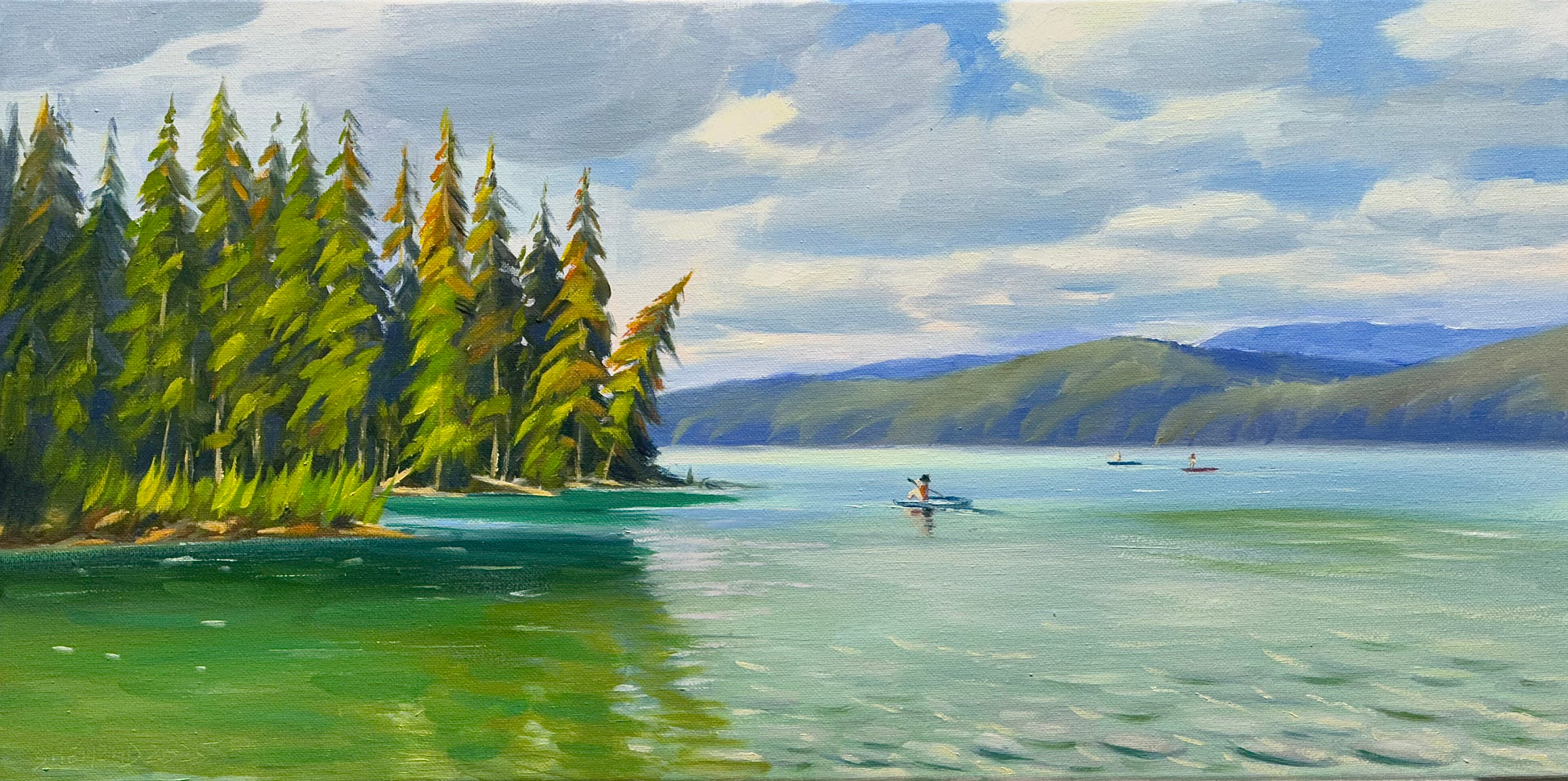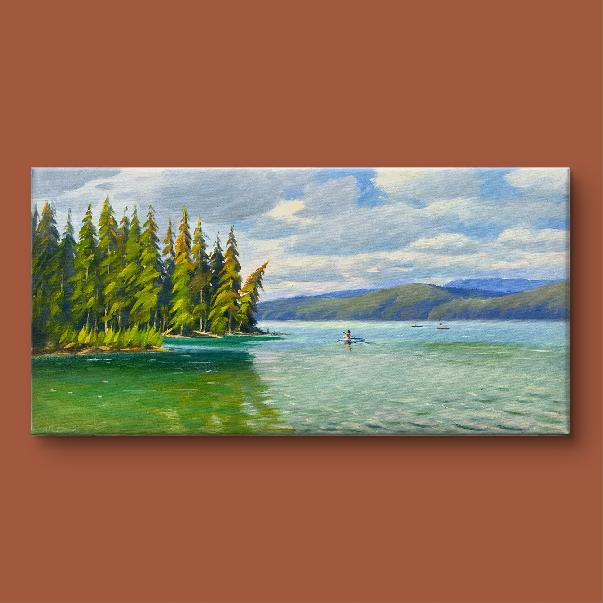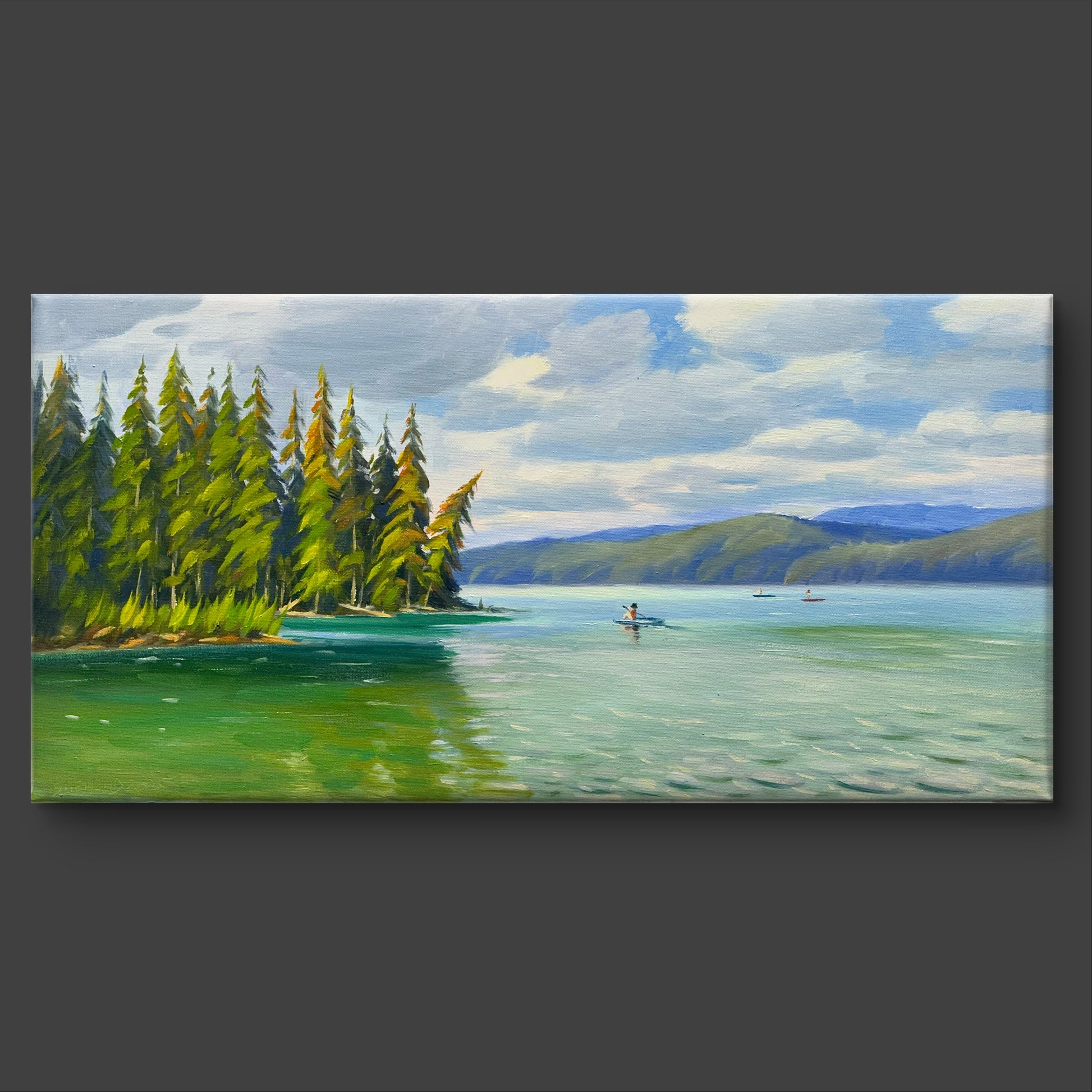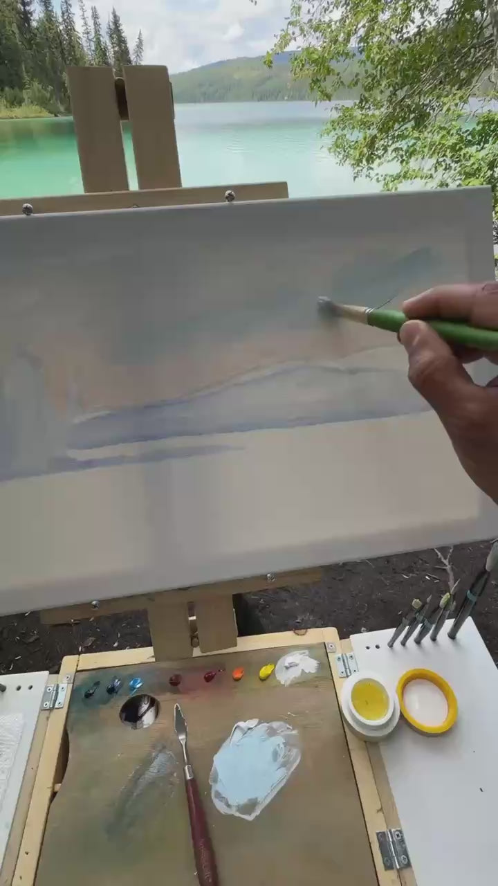 Beautiful Lake Oil painting- 24x12 inch Canvas- On spot oil painting at Johnson Lake BC