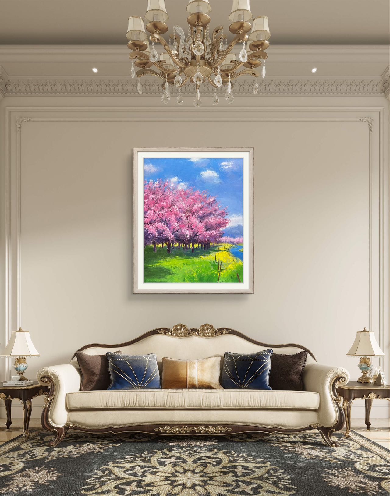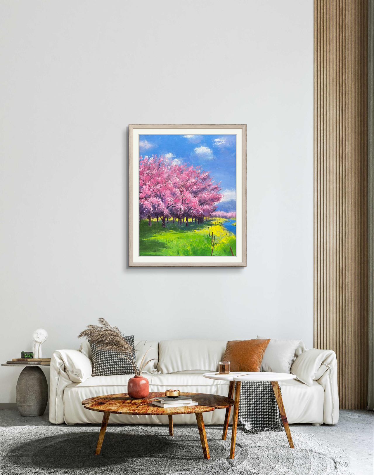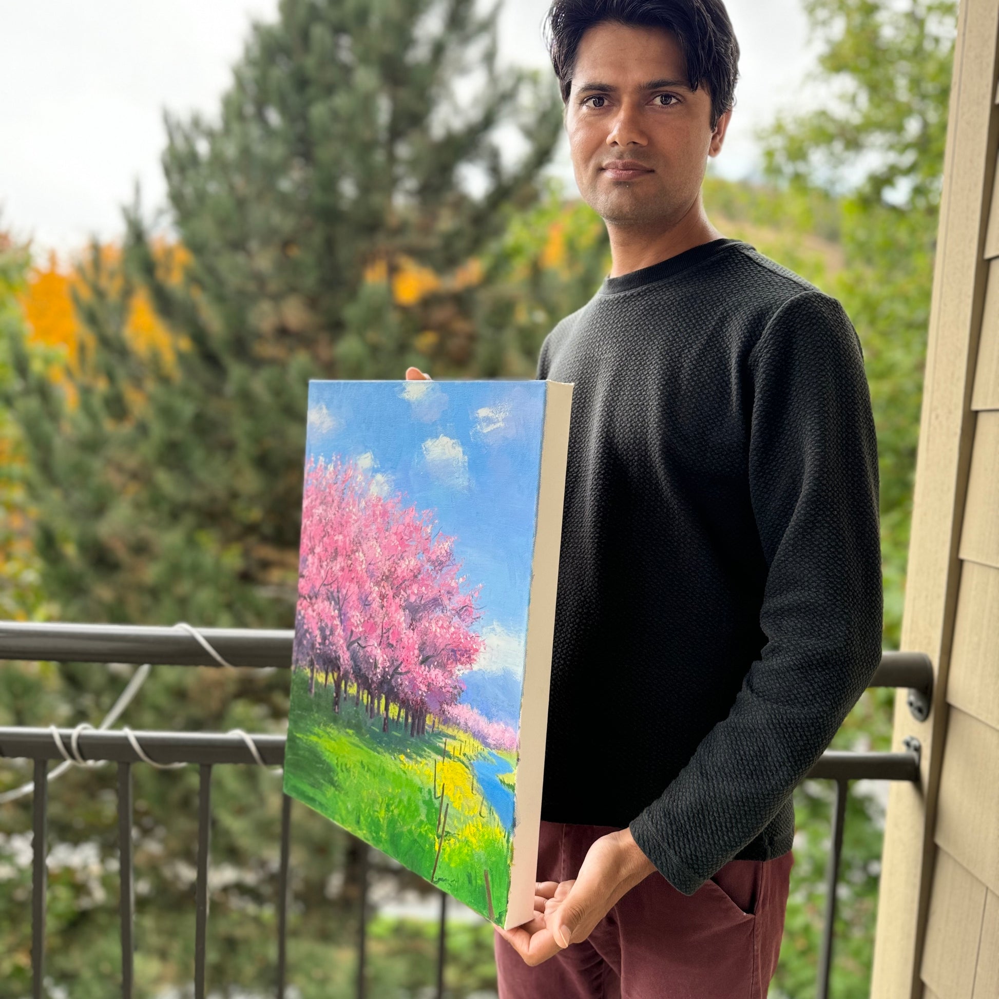 This stunning 16"x20" oil painting on stretched canvas depicts a beautiful cherry blossom tree in full bloom. Created by artist Shehzad Kausar in 2024, this original piece is signed by the artist and is a true work of art. Handmade in British Columbia, Canada, this floral painting is the perfect addition to any art collection or home decor. The canvas is unframed, allowing for customization to suit your personal style. Don't miss out on the opportunity to own a piece of original art from one of Canada's talented artists.