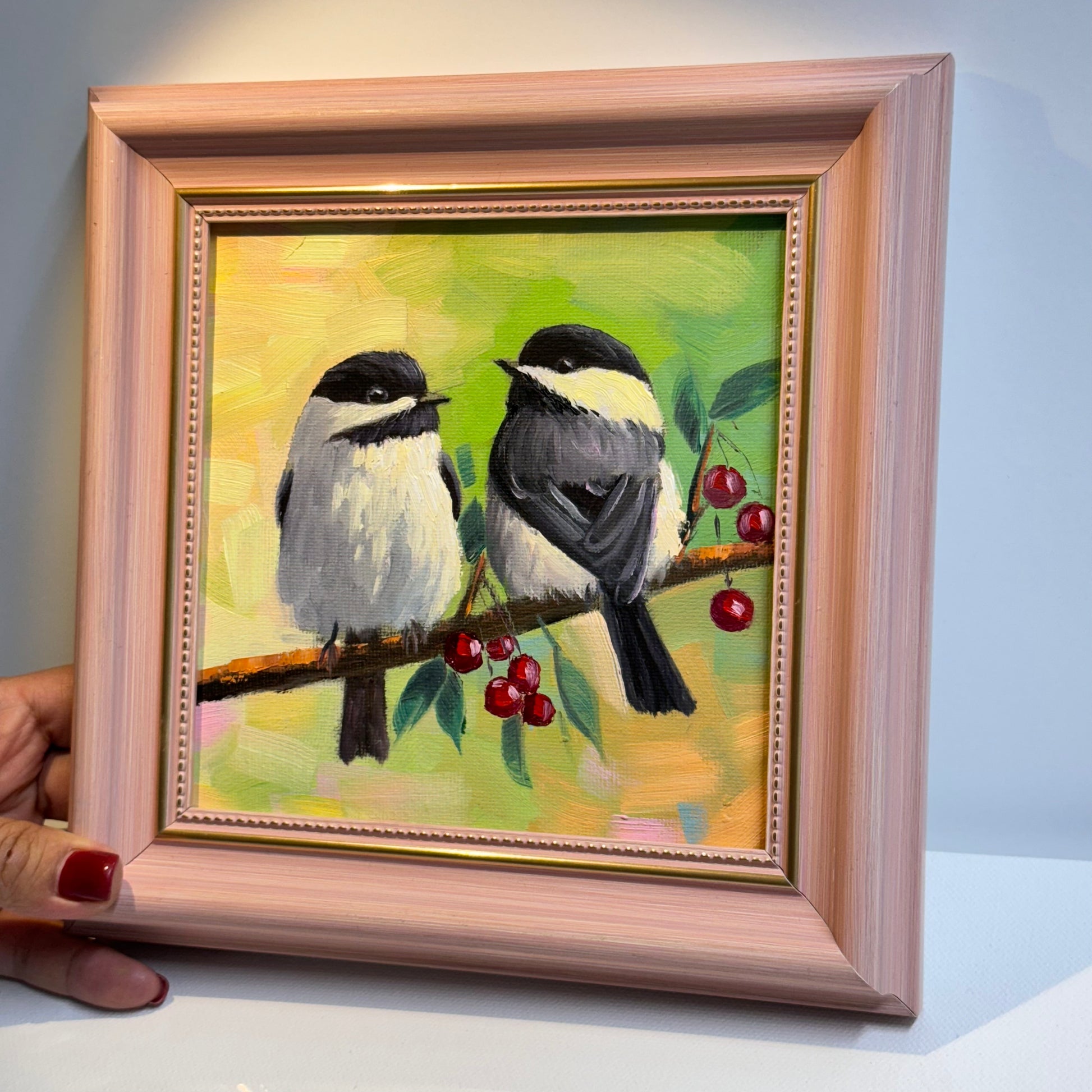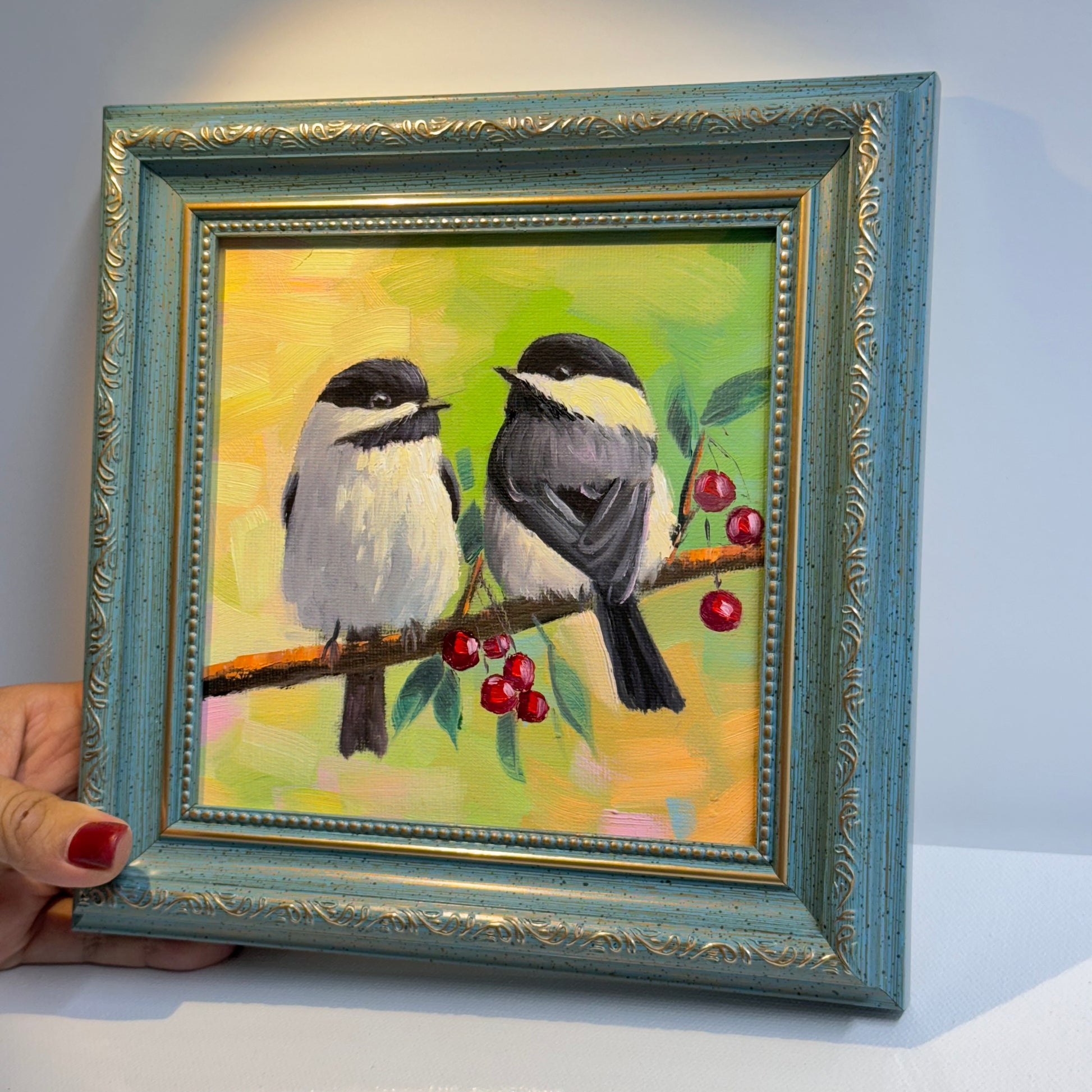 6"x6" Charming Chickadee Pair on a Branch - Original Oil Painting on canvas panel| Hand-Painted Bird Artwork for Nature Lovers