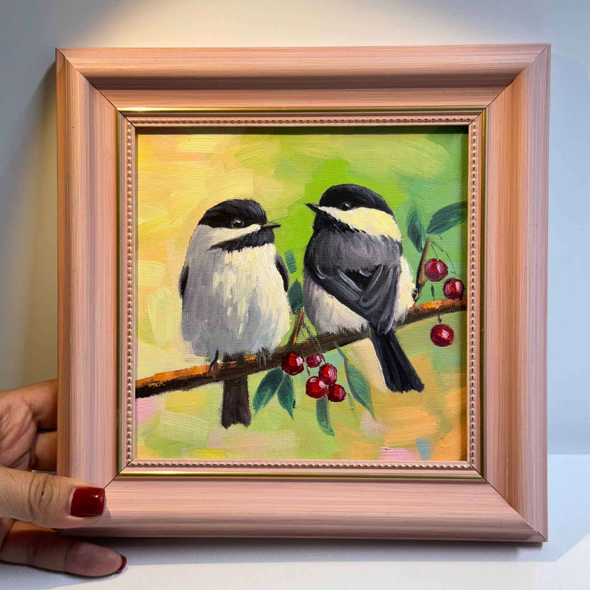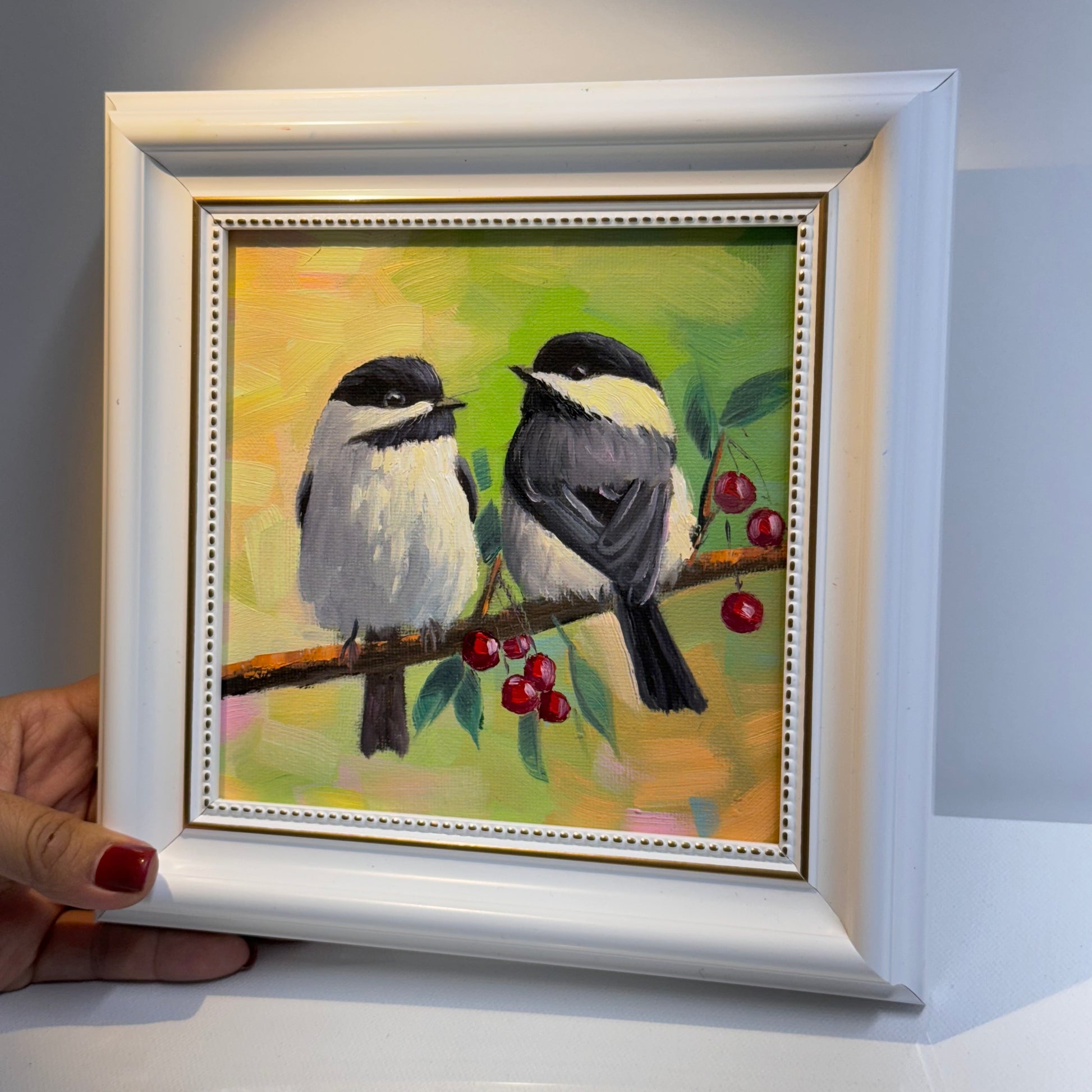 🌼 Immerse yourself in the delightful beauty of this "Charming Chickadee Pair on a Branch" oil painting. Measuring 6” x 6”, this original artwork captures the playful essence of two chickadees perched together, showcasing their distinctive markings and lively expressions. Each brushstroke is meticulously crafted to bring out the intricate details of the birds' feathers and the gentle contours of the branch, creating a heartwarming scene that bird lovers will adore.