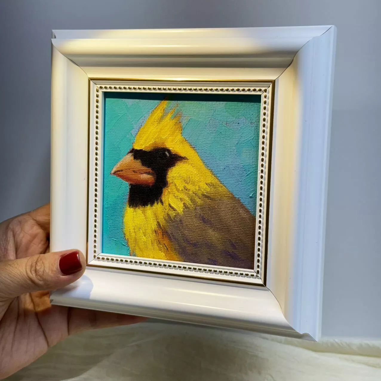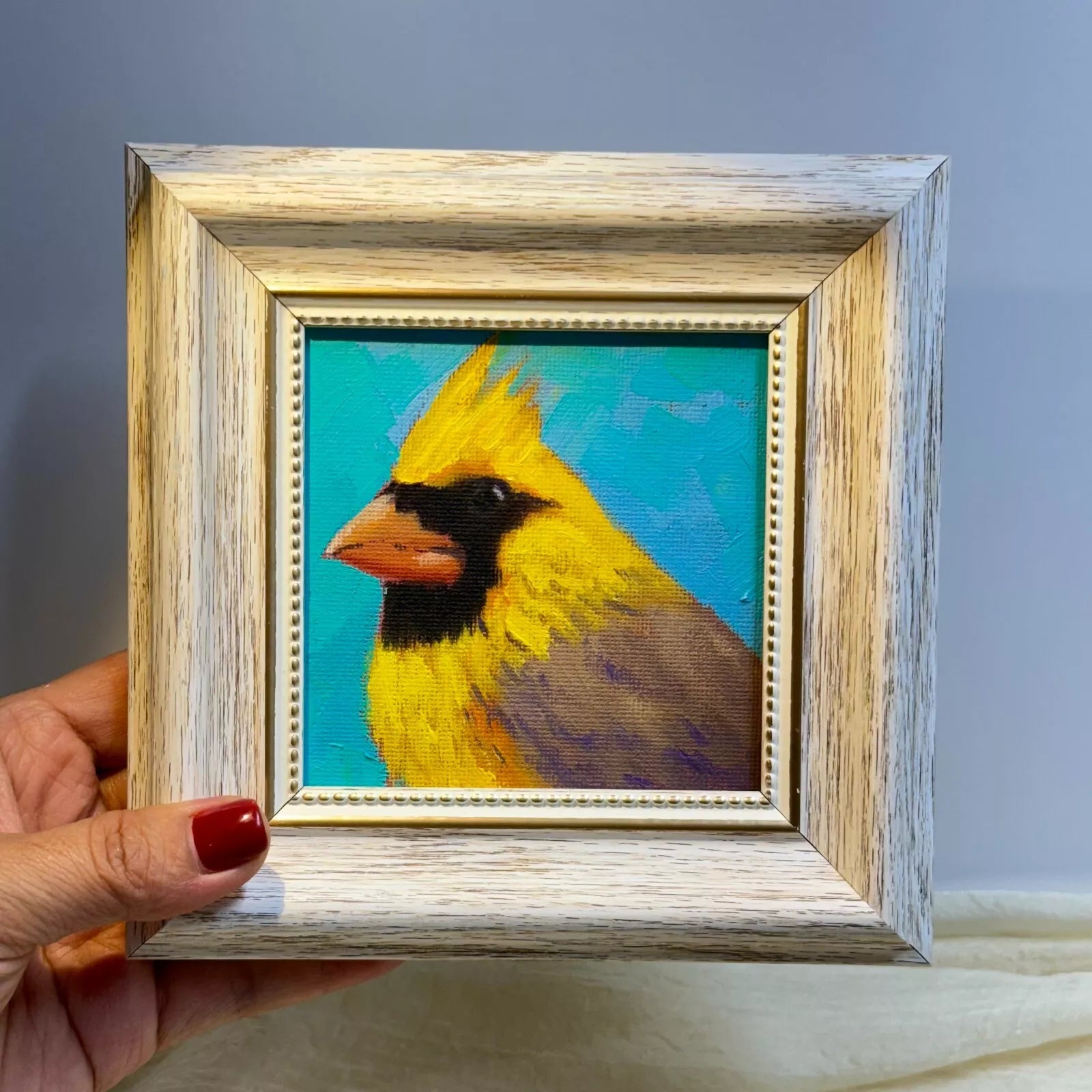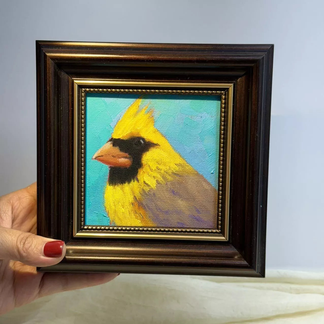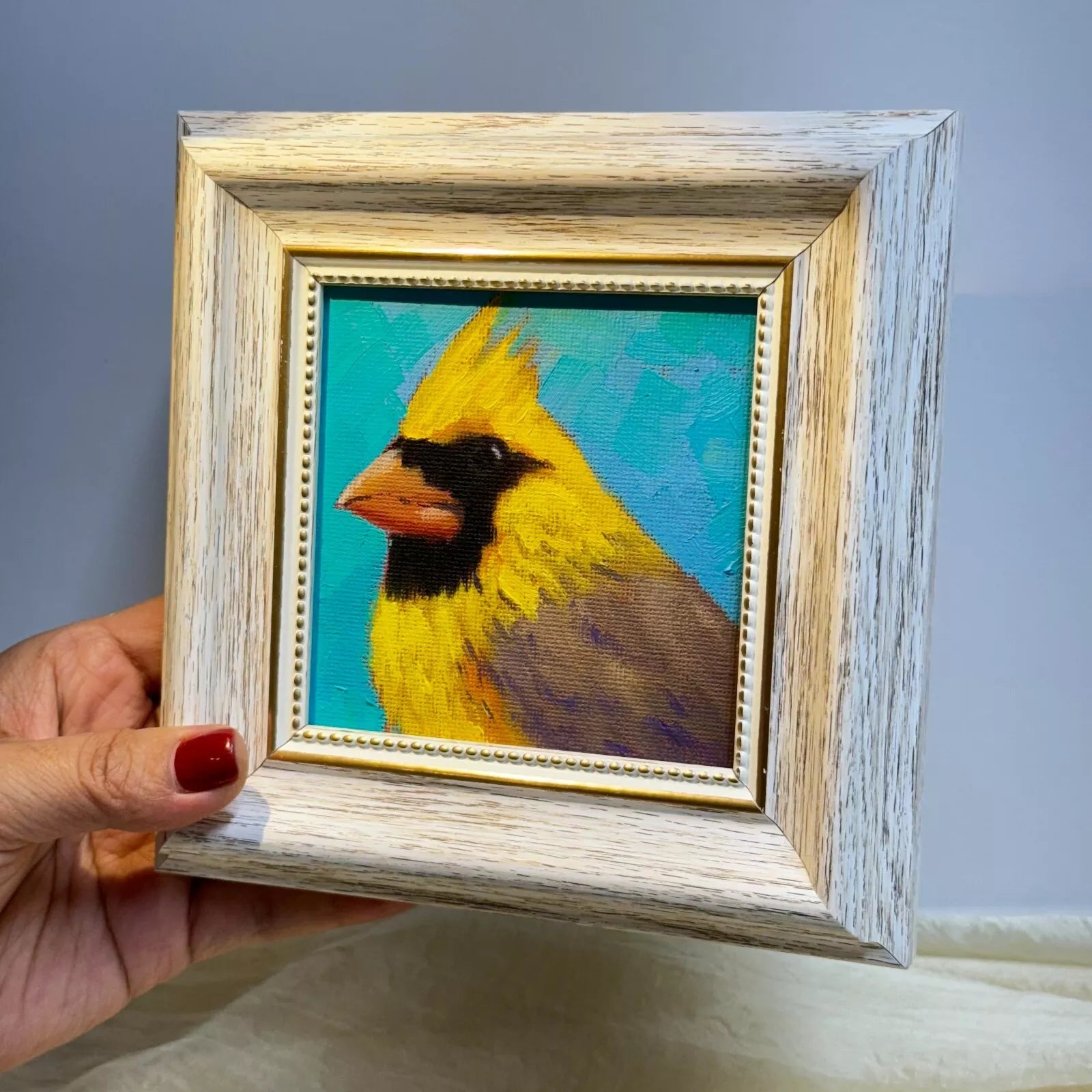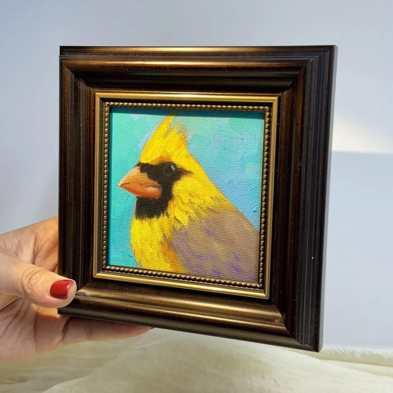 4"x4"Original Yellow Cardinal Birds Oil Painting - Framed Canvas Wall Art - Hand-Painted