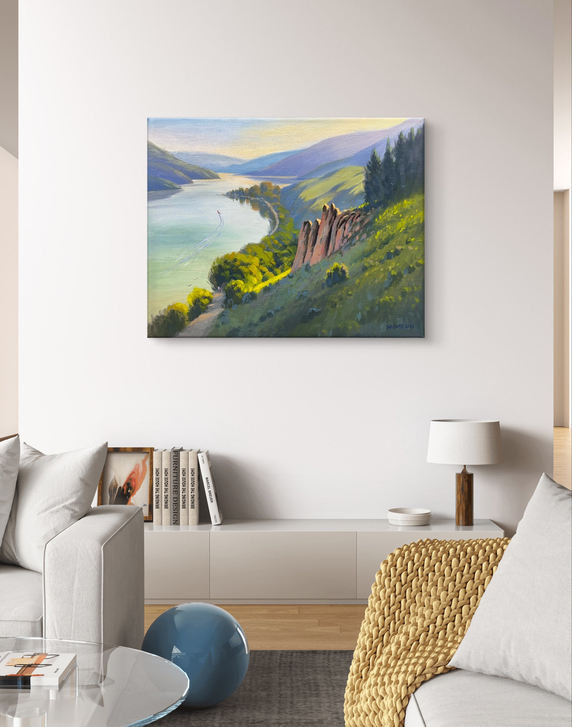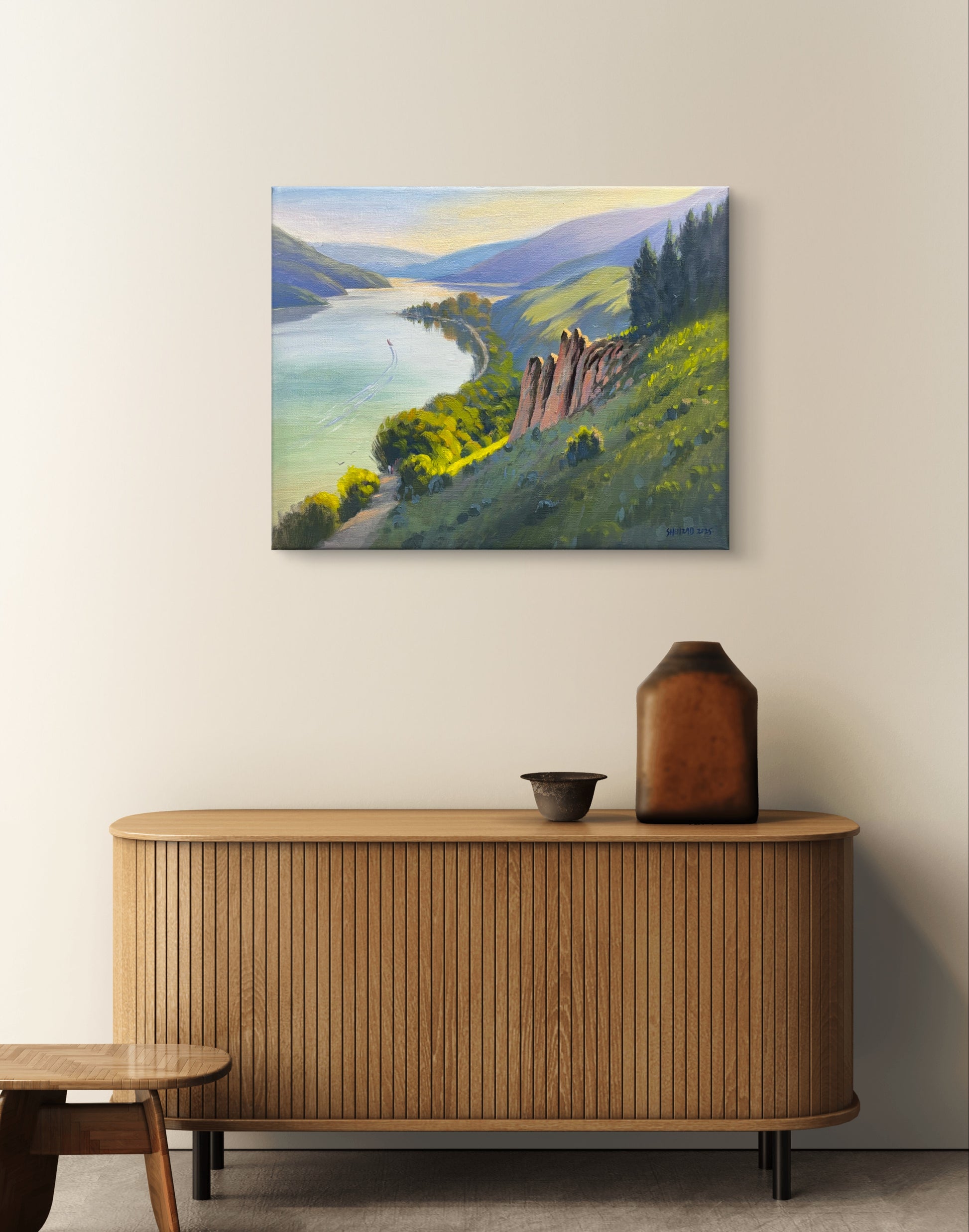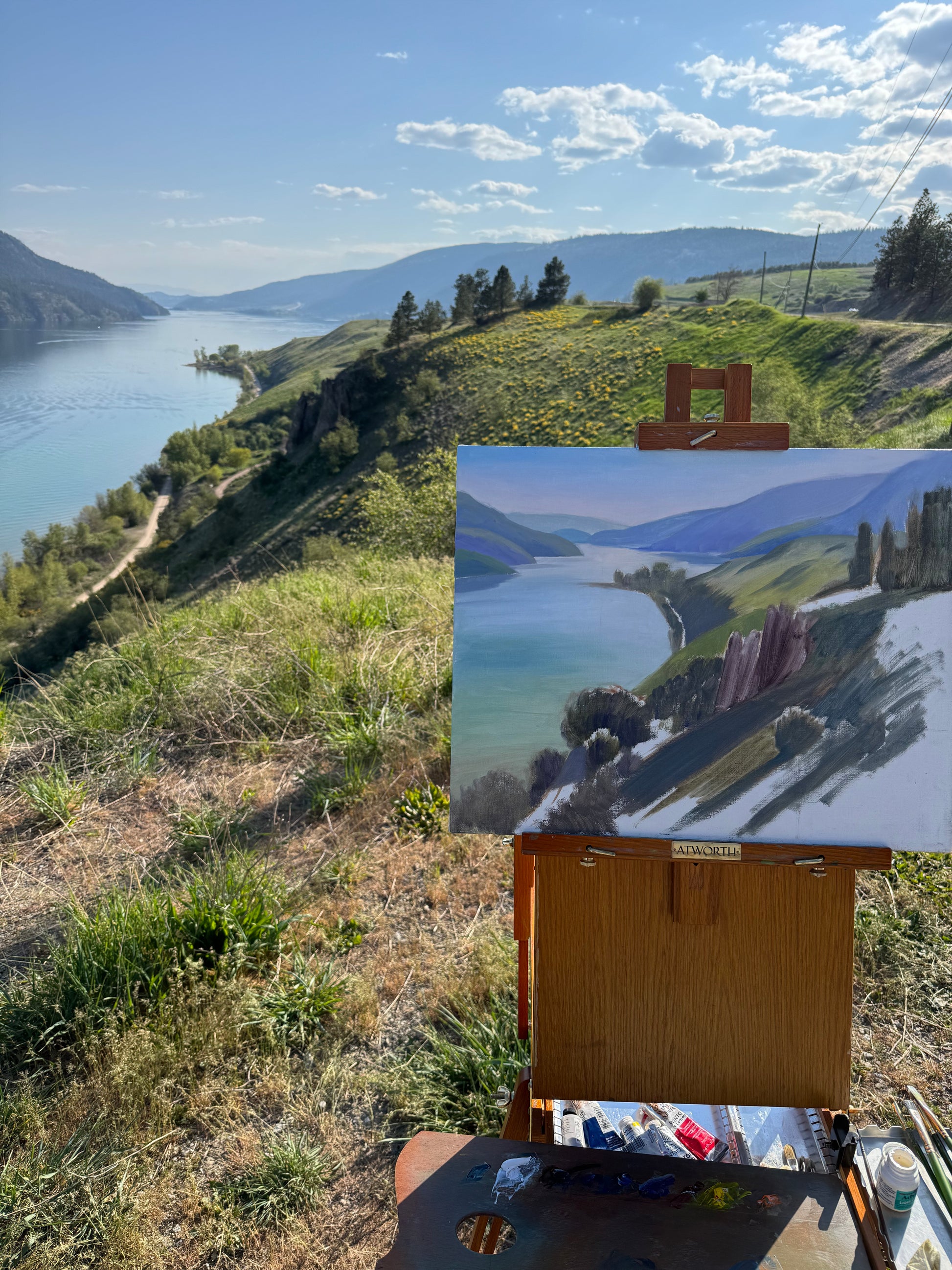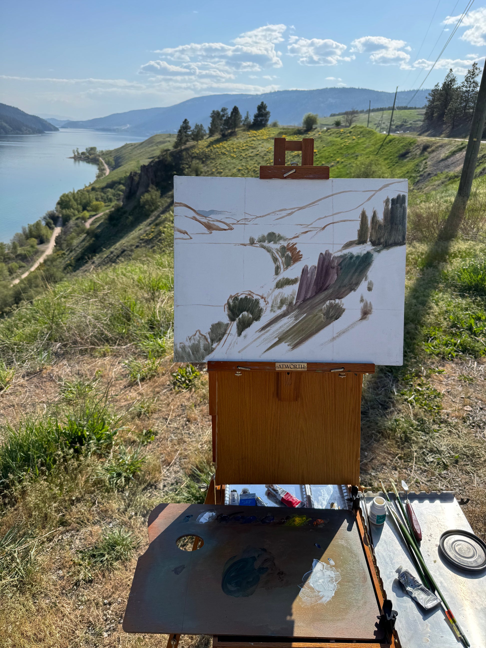 This original oil painting finished on spot at kalamalka lake - captures the striking beauty of Kalamalka Lake's rugged hillside, highlighting its unique vertical rock formations and rich natural hues. With bold brushwork and vibrant tones, the piece evokes the serene yet powerful presence of the landscape, offering a vivid impression of British Columbia’s interior. Painted on a 20"x16" stretched canvas, it's ready to hang or frame according to your preference.
