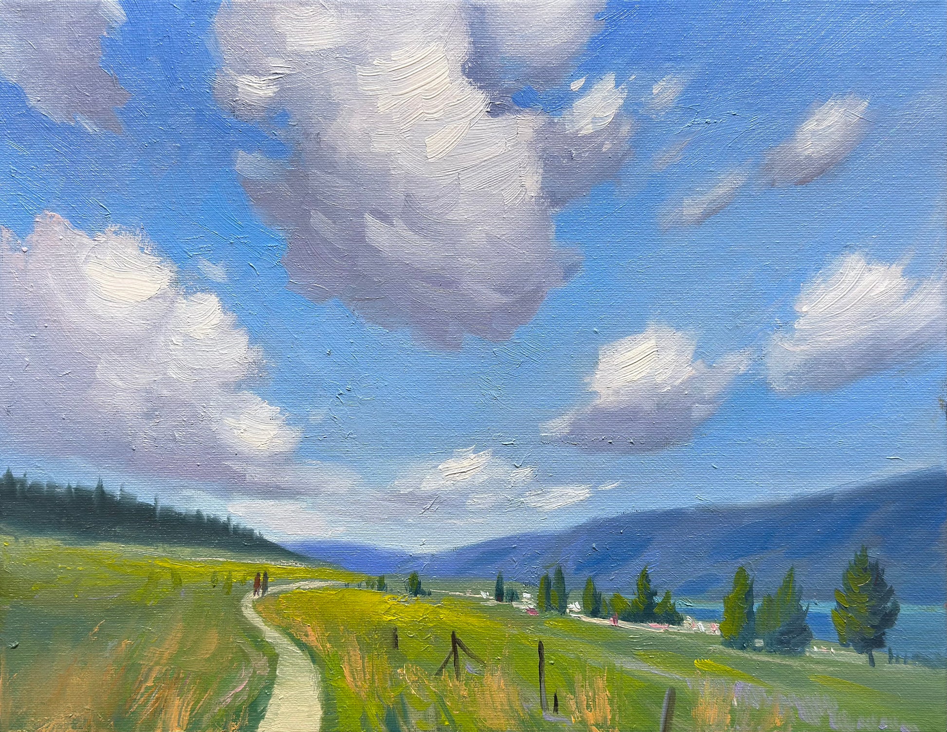 This oil painting captures a peaceful hiking trail near Vernon, leading toward the rolling hills and the shimmering blue of Kalamalka Lake under a sky full of drifting clouds. Inspired by the calm beauty of a summer day outdoors.