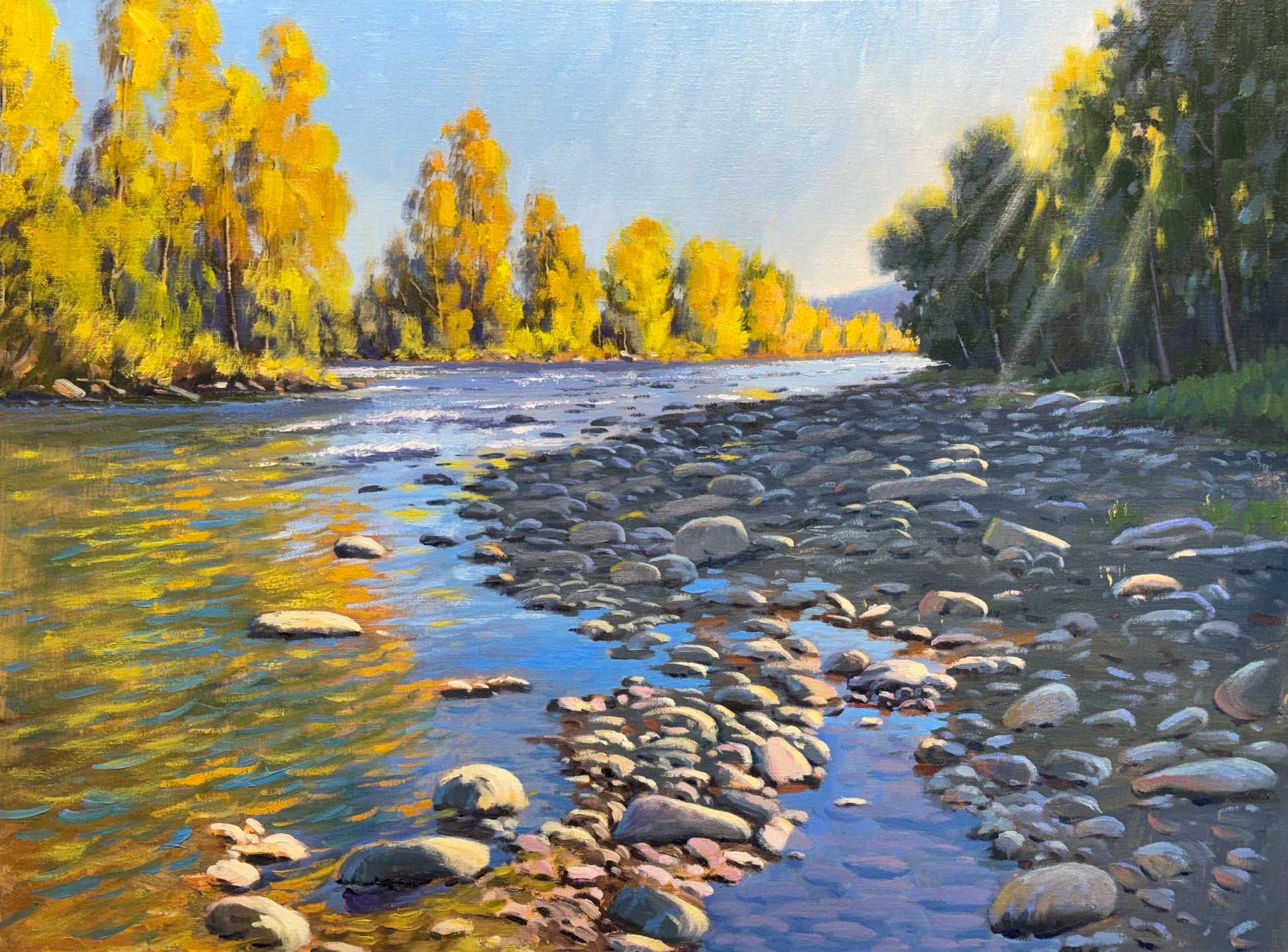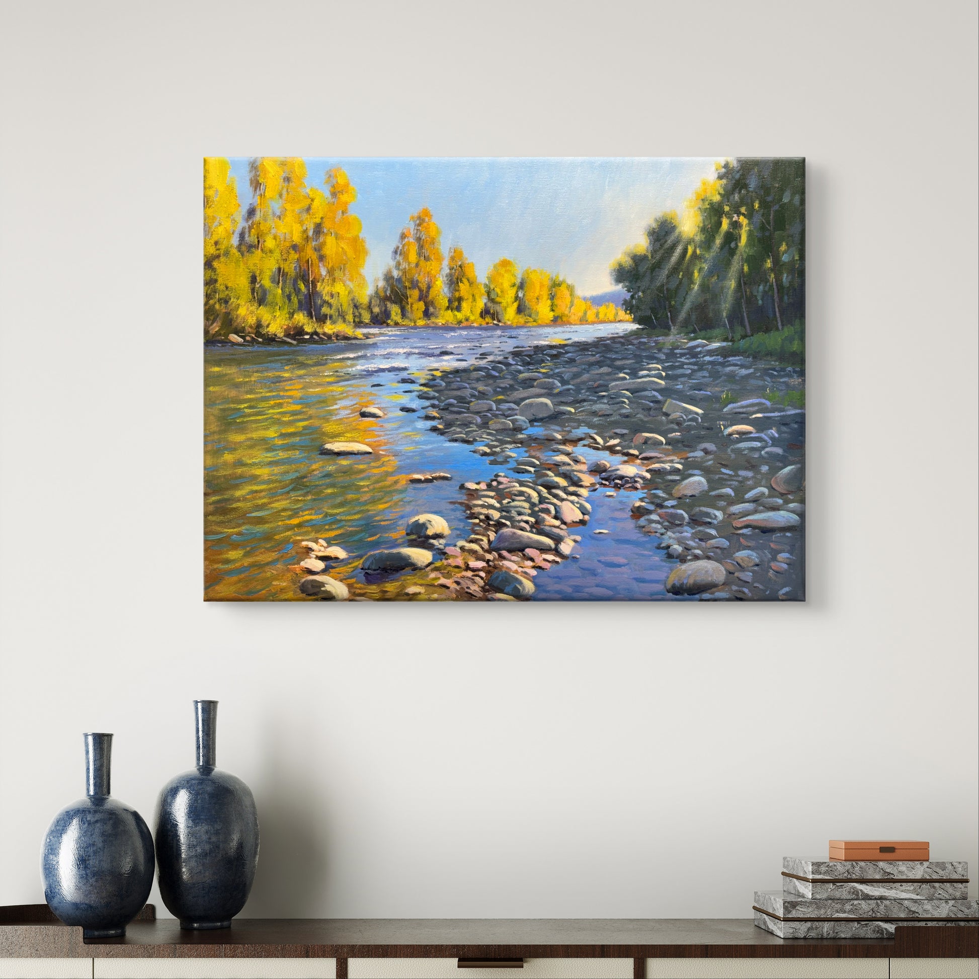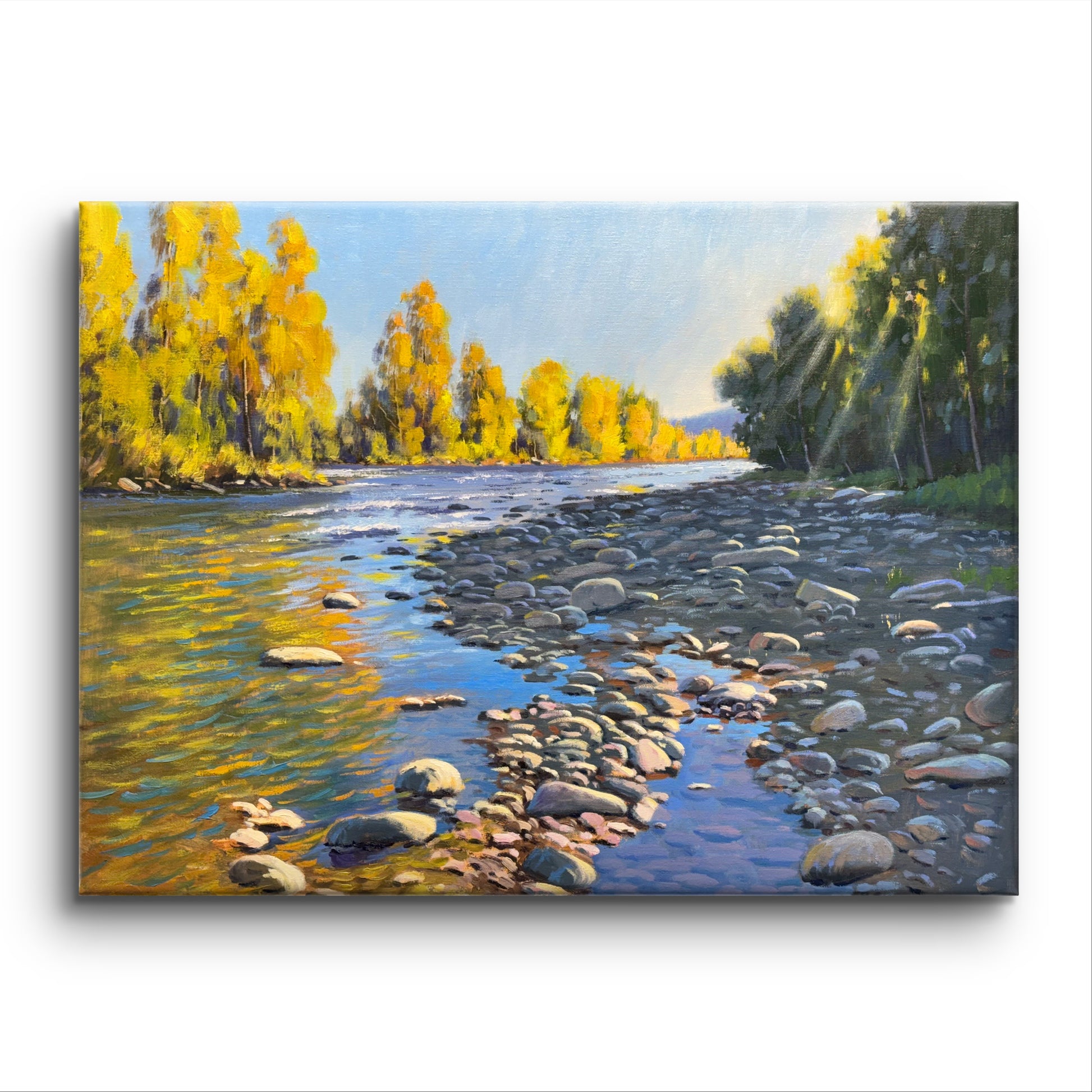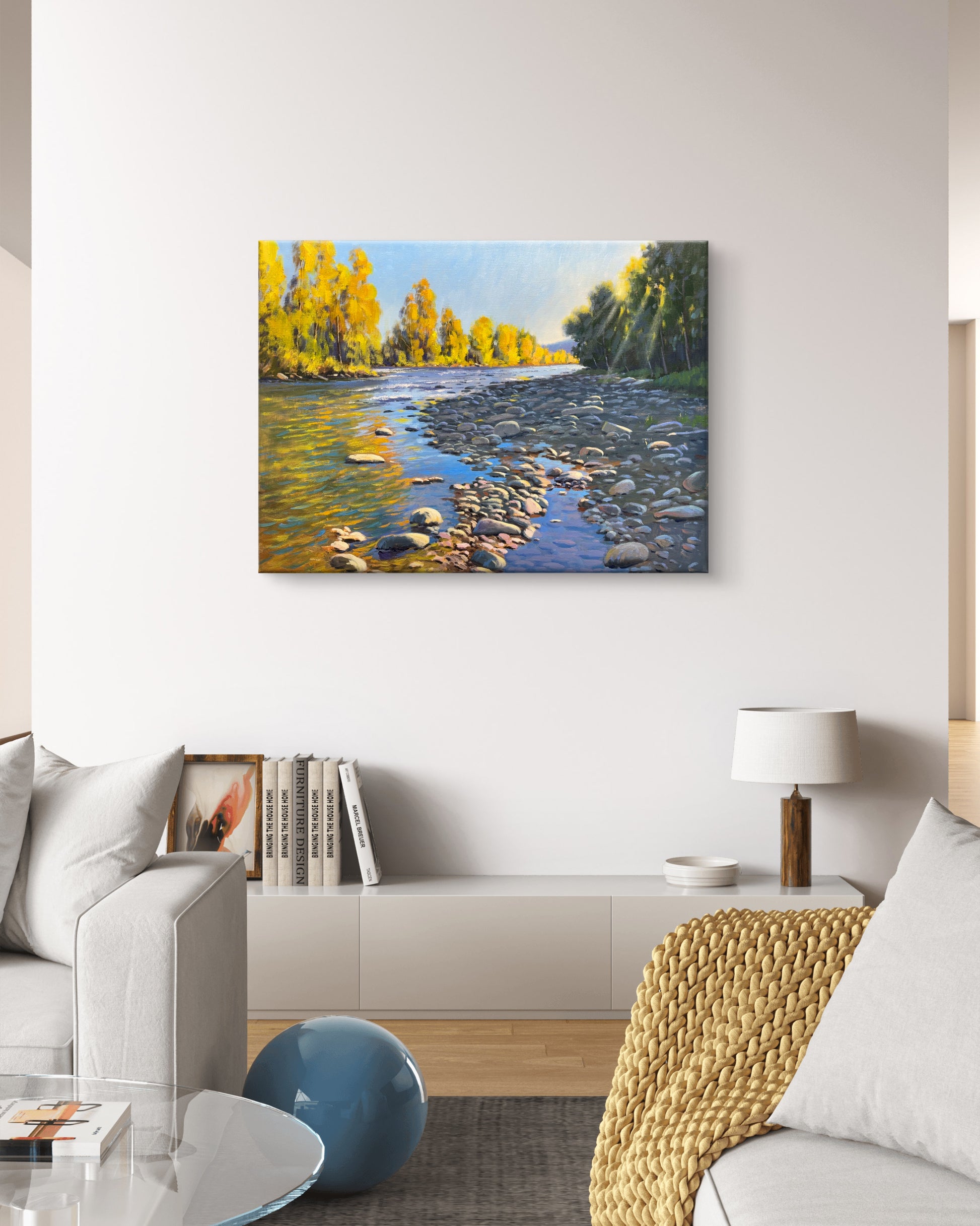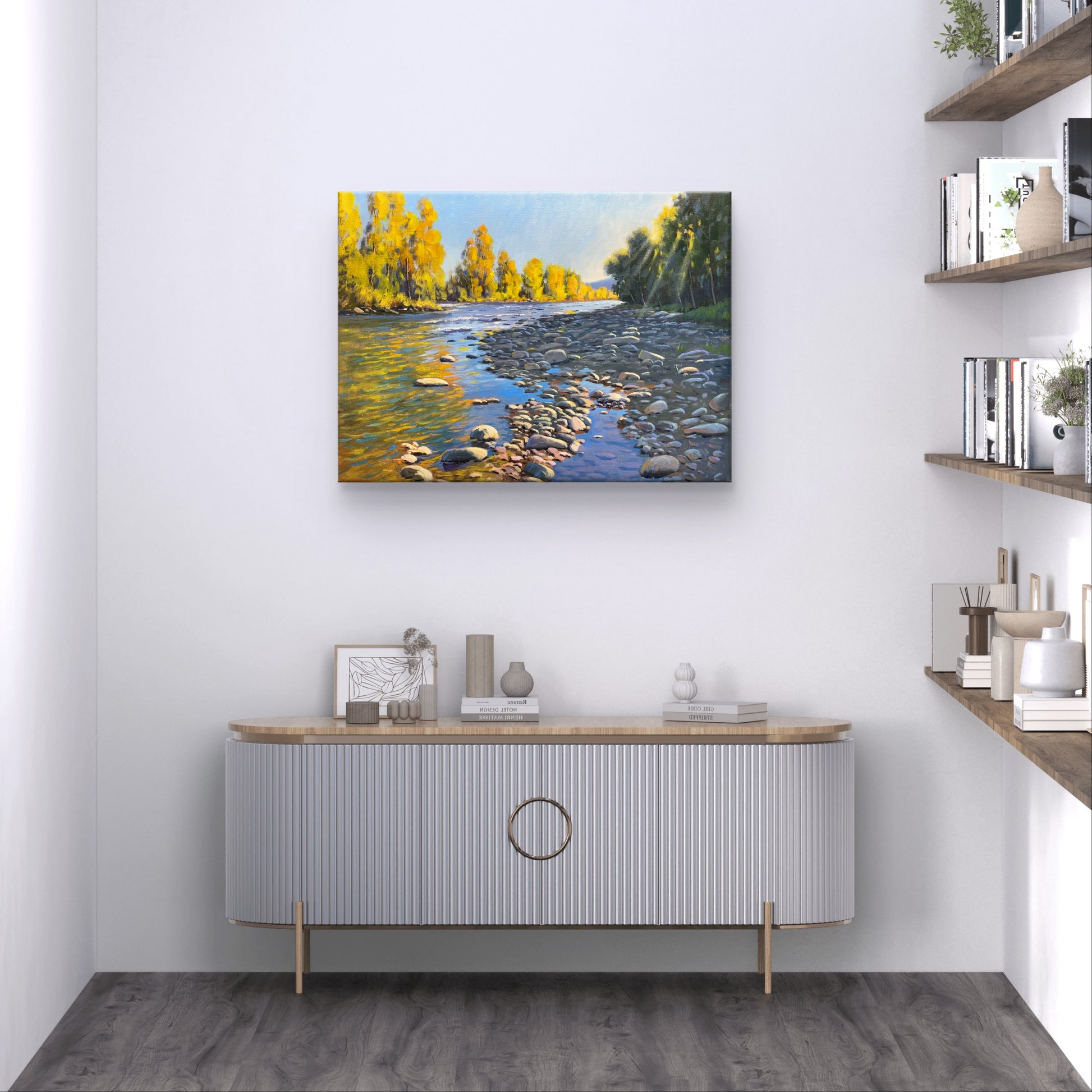 Bring Beauty of fall into your home with this stunning original oil painting of mission creek park in Kelowna. Capturing vibrant colors and shimmering shallow waters of the creek.